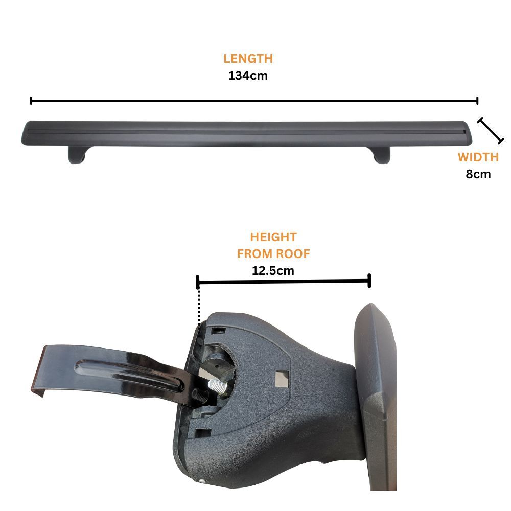 • Dimension: 134(L) x 8(W) x 12.5(Height - starting from your roof rails) cm