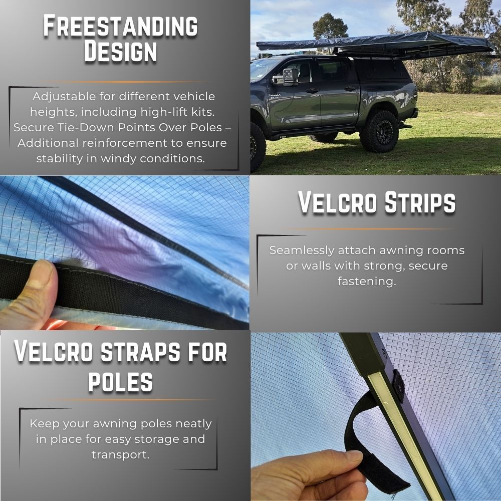 Take your outdoor setup to the next level with the 270° XL Freestanding 600D Ripstop Fabric Fox Awning, built for strength, convenience, and all-weather protection. Designed for serious adventurers, this awning offers one of the most extensive coverages on the market and a hassle-free setup.