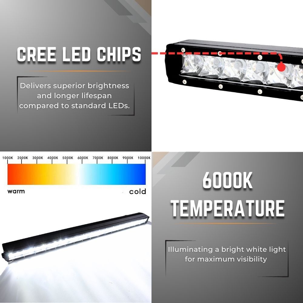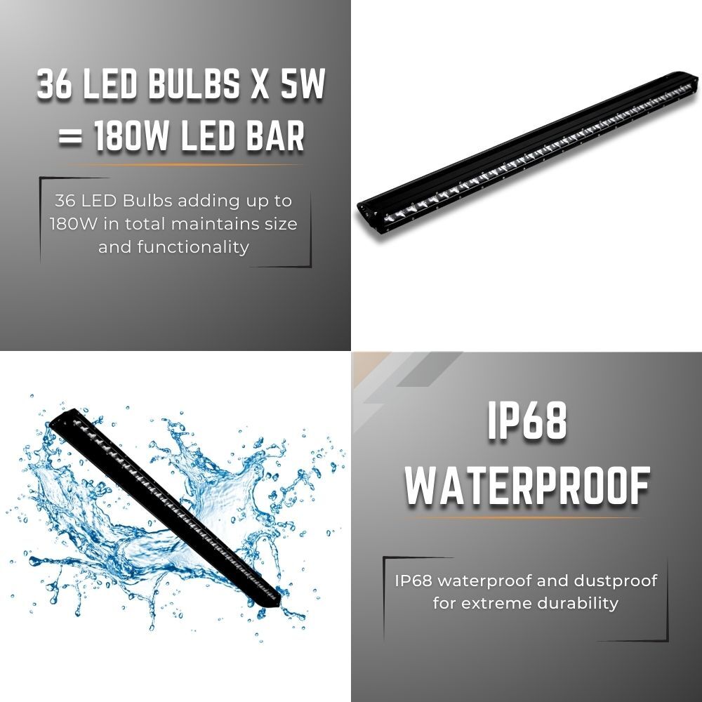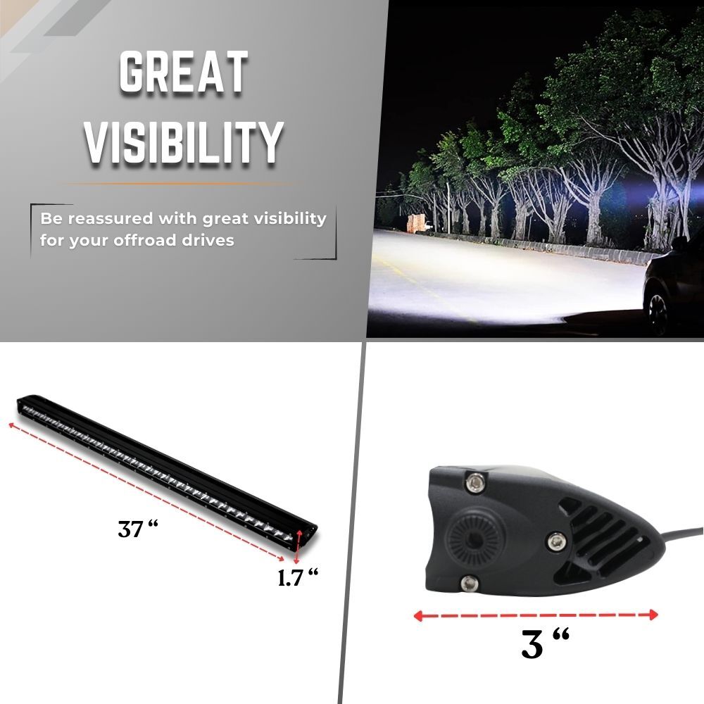 Experience unmatched visibility and durability with our 37-inch 180W CREE LED Light Bar, designed for off-road enthusiasts and professionals who demand superior performance. Featuring high-intensity CREE LEDs, ensuring both long-distance reach and wide-area illumination. Built with die-cast aluminium housing and a shatterproof polycarbonate lens, it withstands harsh conditions, while its IP68 waterproof rating protects against dust, mud, and heavy rain. Advanced heat sink technology ensures optimal cooling for a lifespan exceeding 50,000 hours, making it a reliable companion for UTES, SUVS, and other off-road vehicles. Whether tackling rugged trails, working in low-light conditions, or enhancing nighttime visibility, this premium LED light bar offers the perfect balance of power, efficiency, and durability to conquer the darkness.