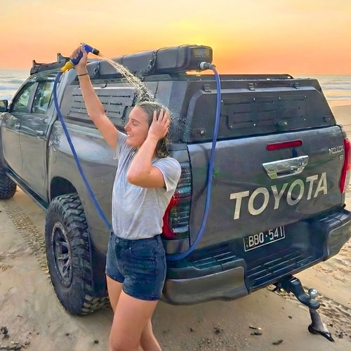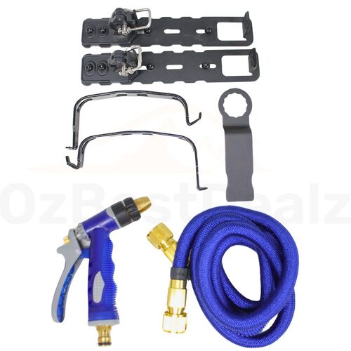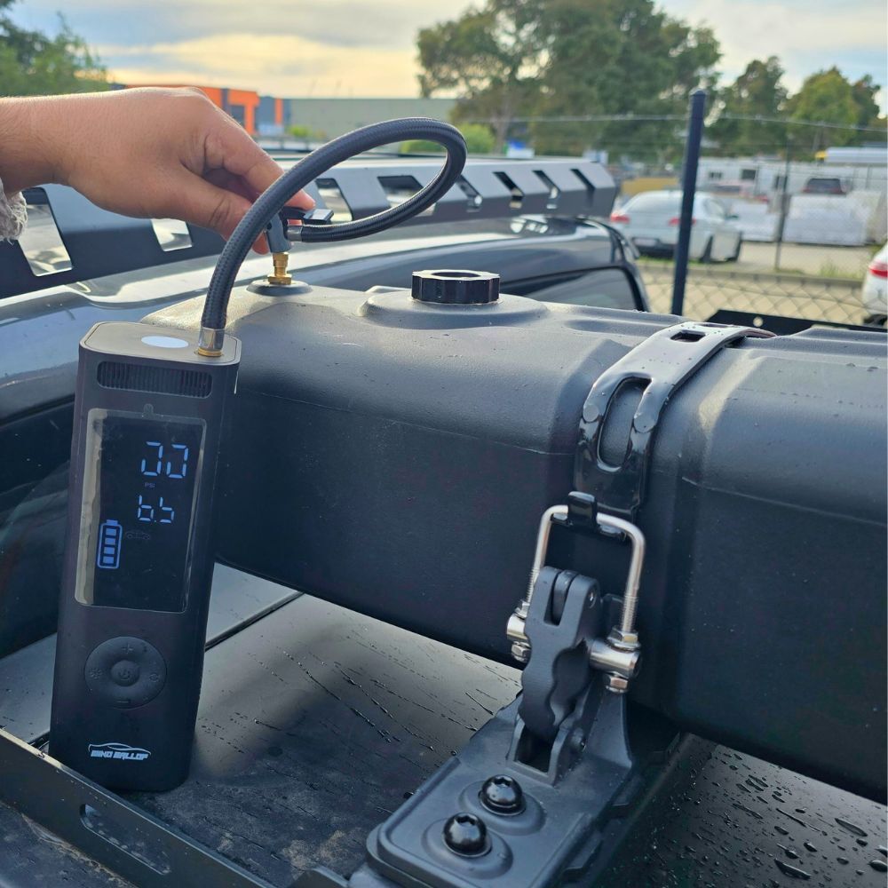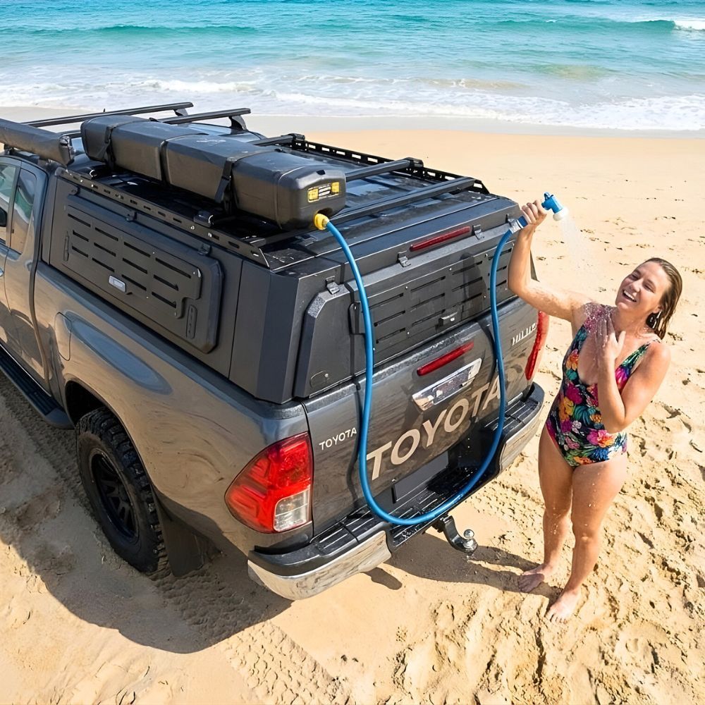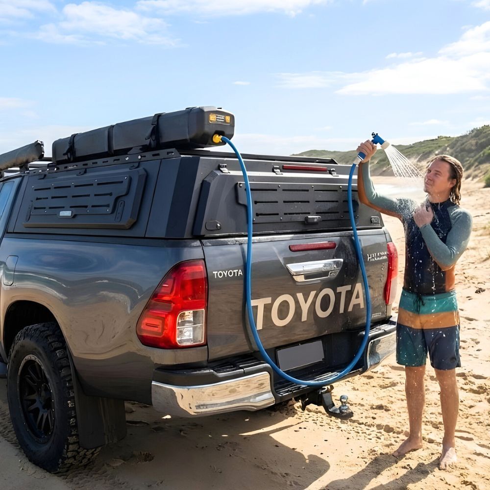 Upgrade your outdoor adventures with this compact and efficient water tank solution. Our 28L Air Compressed Water Tank delivers instant water pressure at the push of a button, thanks to its innovative design. No more manual pumping or waiting for gravity-fed systems. The included hose, nozzle, and extra clamps provide a versatile and secure setup. Easily mount it to your vehicle roof racks or canopy with the provided brackets. Perfect for camping, overlanding, or any outdoor activity where clean water is essential. Experience the convenience and performance of air-compressed water storage.