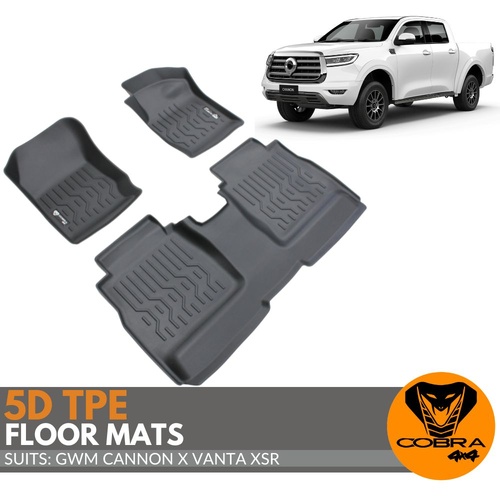 Cobra 4x4 5D TPE floor mat liner suitable for GWM Cannon X, VANTA, XSR, ULTRA DC models. Protect your car with our durable 5D TPE Floor mat liner. These mats are designed to fit perfectly and shield your floor from spills and dirt. Easy to clean and built to last, they're the ultimate solution for keeping your vehicle's interior looking its best.