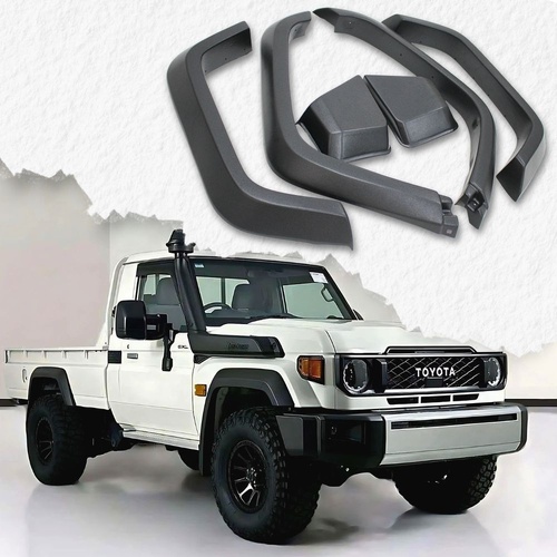 Upgrade your Landcruiser 79 Series Single Cab 2024 Onwards with these premium OEM Style Matte Black Textured Fender Flares. Crafted from durable ABS plastic with a textured finish, these fender flares are designed to seamlessly blend with your vehicle's aesthetics while providing superior protection against road debris and harsh weather conditions.