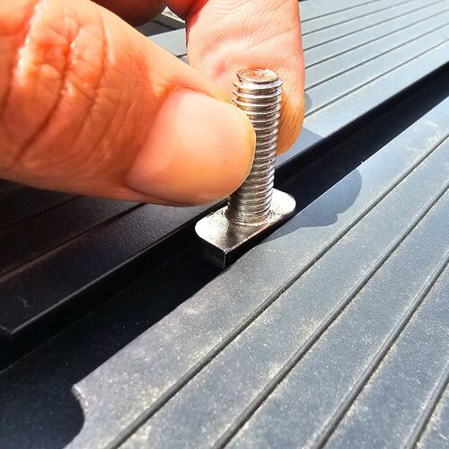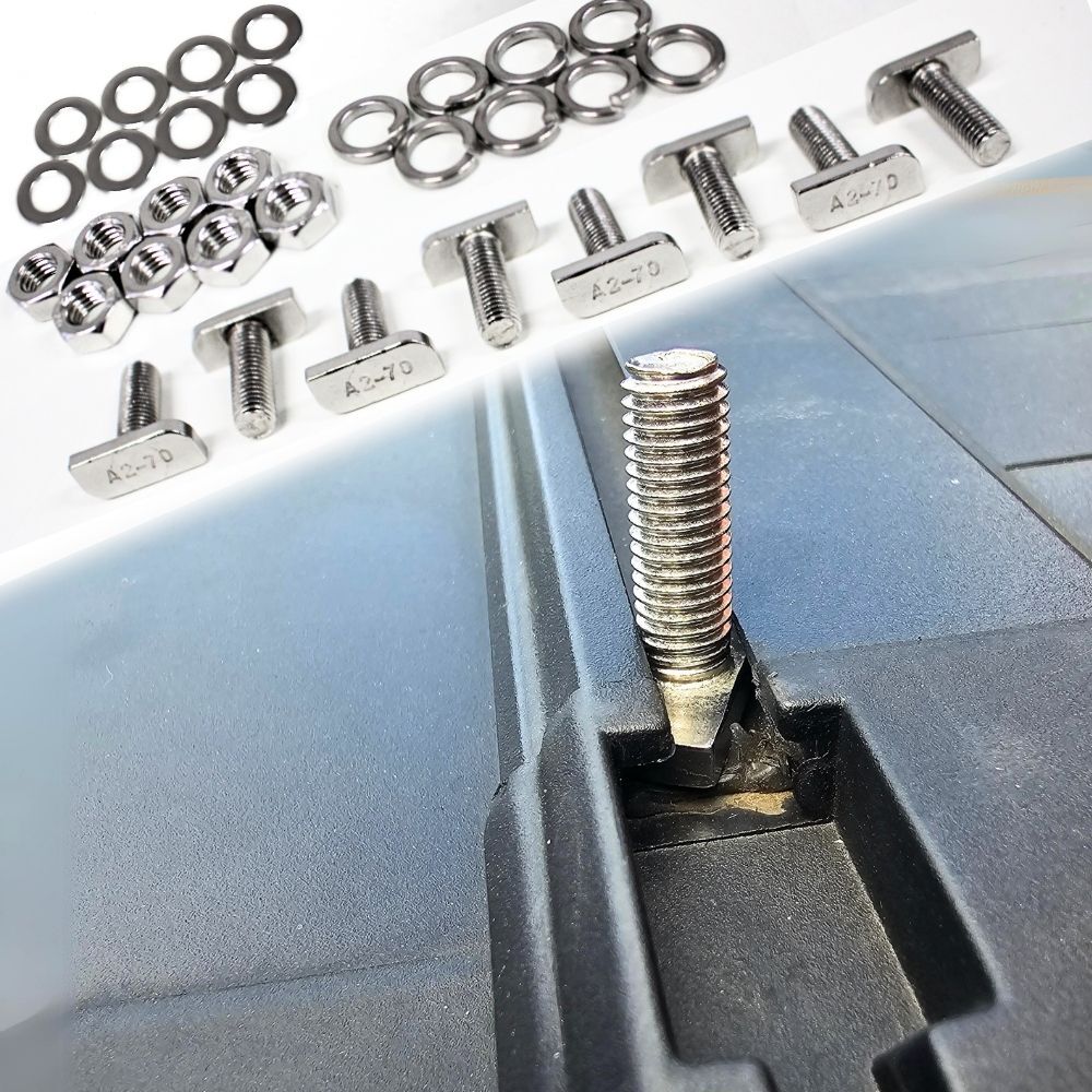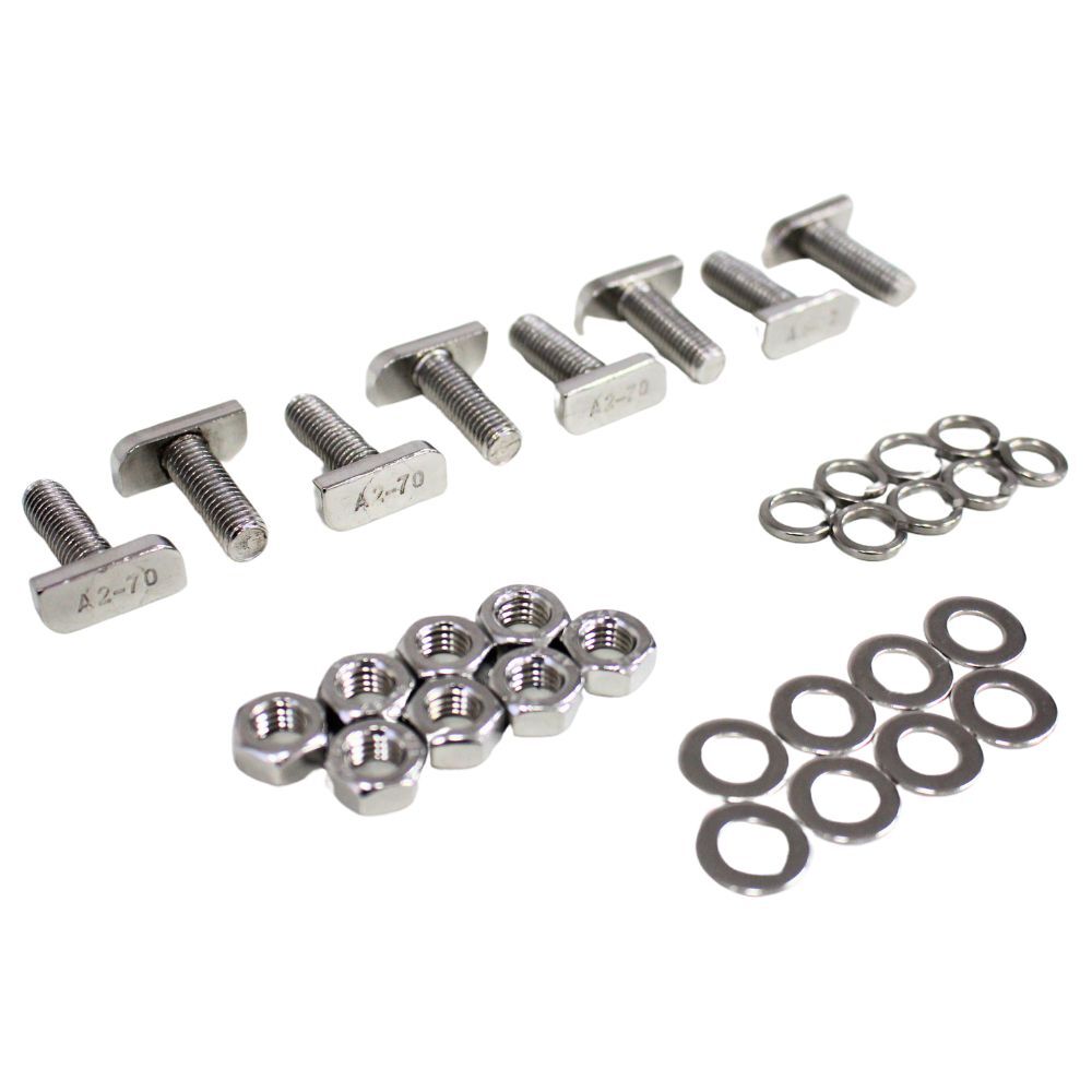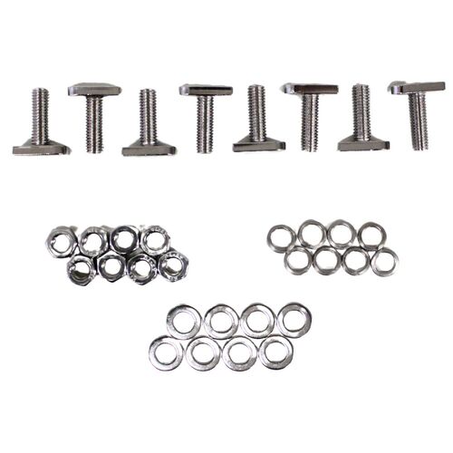Heavy duty stainless steel M8 x 23mm T- Bolts + Nuts + washers + spring washers suitable to roof racks and roller shutters with an open channel more than 8mms. The T head section of this screw is 4mm thick, 10mm x 22mm wide