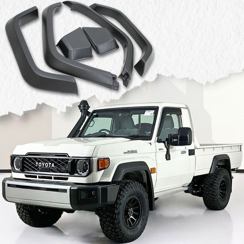 Upgrade your Landcruiser 79 Series Single Cab 2024 Onwards with these premium OEM Style Matte Black Textured Fender Flares. Crafted from durable PP plastic with a textured finish, these fender flares are designed to seamlessly blend with your vehicle's aesthetics while providing superior protection against road debris and harsh weather conditions.