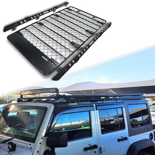 Aluminium Flat Mesh Roof Rack Platform Suits Jeep JK JL Wrangler Brackets Black Powder Coated
