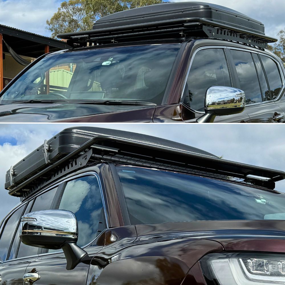 Measuring 220cm (L) x 125cm (W), this rack features a thick black powder-coated finish for durability and a sleek appearance. Its sturdy Cobra 4x4-style brackets provide a cost-effective, premium alternative to pricier aluminum racks, making it perfect for mounting rooftop tents without modification by simply removing the side rails without needing to brind them off.
