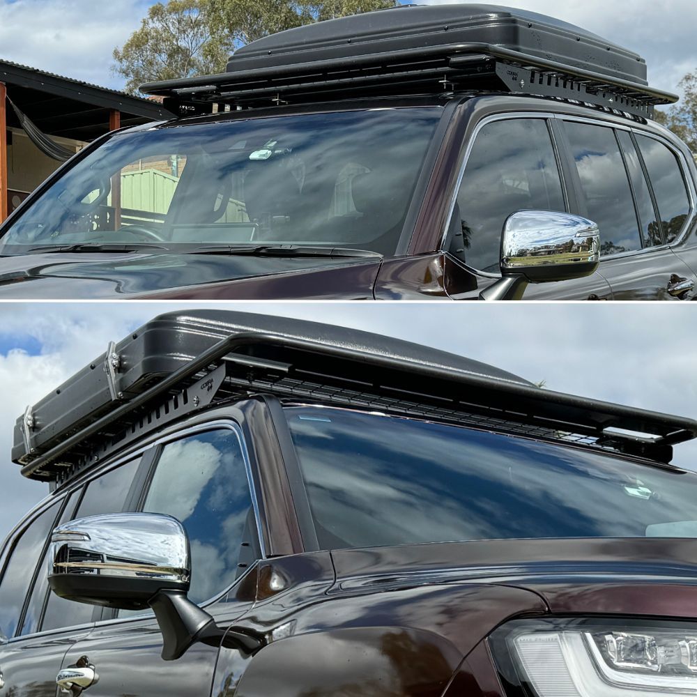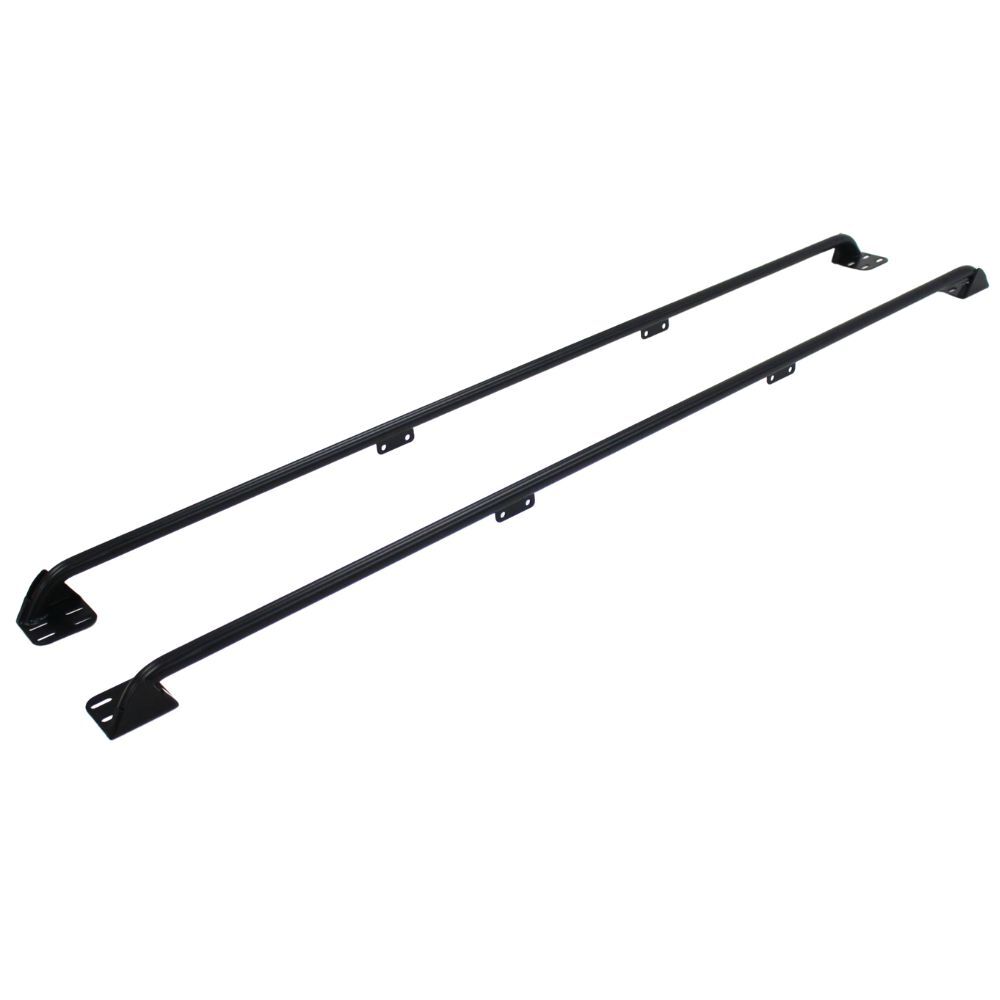 Measuring 220cm (L) x 125cm (W), this rack features a thick black powder-coated finish for durability and a sleek appearance. Its sturdy Cobra 4x4-style brackets provide a cost-effective, premium alternative to pricier aluminum racks, making it perfect for mounting rooftop tents without modification by simply removing the side rails without needing to brind them off.