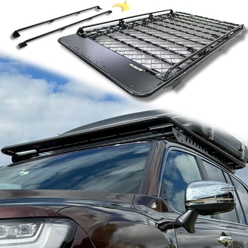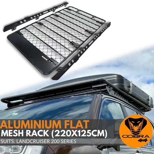 Aluminium Flat Mesh Roof Rack With Removable Side Rails Suits Landcruiser 200 Series 220cm x 125cm Platform Brackets Black Powder Coated