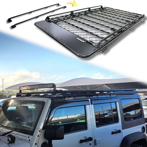 Aluminium Flat Mesh Roof Rack With Removeable Side Rails Suits Jeep JK JL Wrangler 220cm x 135cm Platform Brackets Black Powder Coated