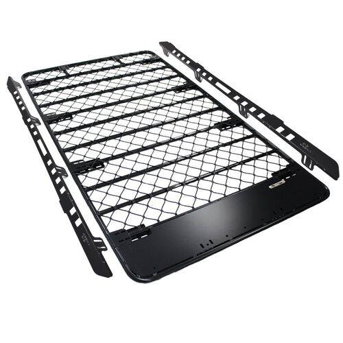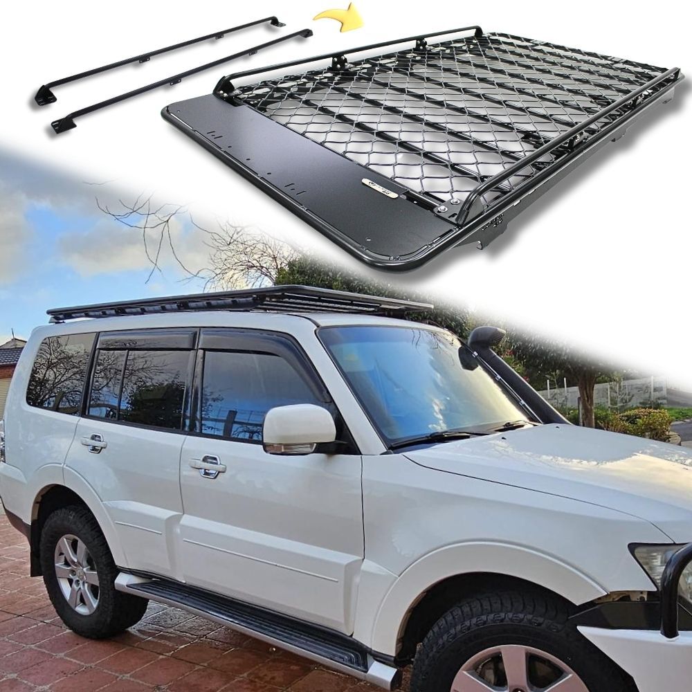 Aluminium Flat Mesh Roof Rack With Removeable Side Rails Suits Mitsubishi Pajero 2007 Onwards 220cm x 125cm Platform Brackets Black Powder Coated
