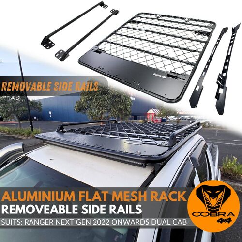 Aluminium Flat Mesh Roof Rack With Removeable Side Rails Suits Ranger Next Gen 2022 Onwards Platform Brackets Black Powder Coated