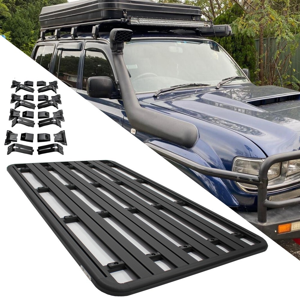 Aluminium Flat Roof Rack Cage Fits Landcruiser 80 90 Series Prado Patrol GU GQ 220cm x 125cm Rain Gutter Mounts Tradie Black Rack