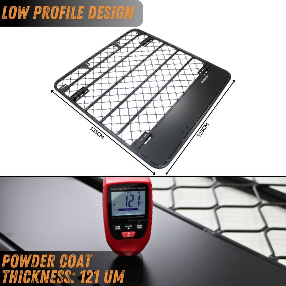 Measuring 135CM front to back and 125cm left to right, this rack is not only enhanced with a durable thick Black Powder Coating for a sleek aesthetic but is also a rugged solution for your adventures. Precision-engineered and equipped with sturdy brackets, it seamlessly blends style and functionality for your Hilux. Elevate your vehicle's utility with this robust and versatile Aluminium Rack - a perfect fusion of form and durability, giving you the option to add a roof top tent with the flat design