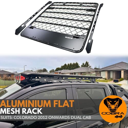 The Cobra 4x4 Aluminium Flat Mesh Roof Rack (AFM) to suit Holden Colorado 2012 Onwards dual cab models. Take it up a notch with the Cobra 4x4 bracket, providing a stylish alternative at a fraction of the cost, mimicking the appearance of pricier aluminum racks on the market.