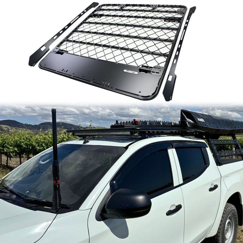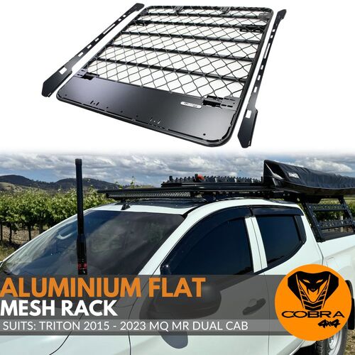 The Cobra 4x4 Aluminium Flat Mesh Roof Rack (AFM) to suit Mitsubishi Triton 2015 - 2023 MQ MR dual cab models. Take it up a notch with the Cobra 4x4 bracket, providing a stylish alternative at a fraction of the cost, mimicking the appearance of pricier aluminum racks on the market.