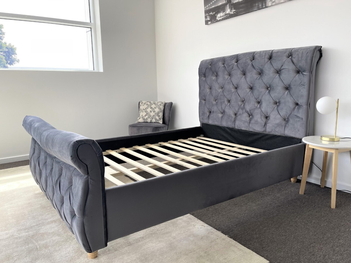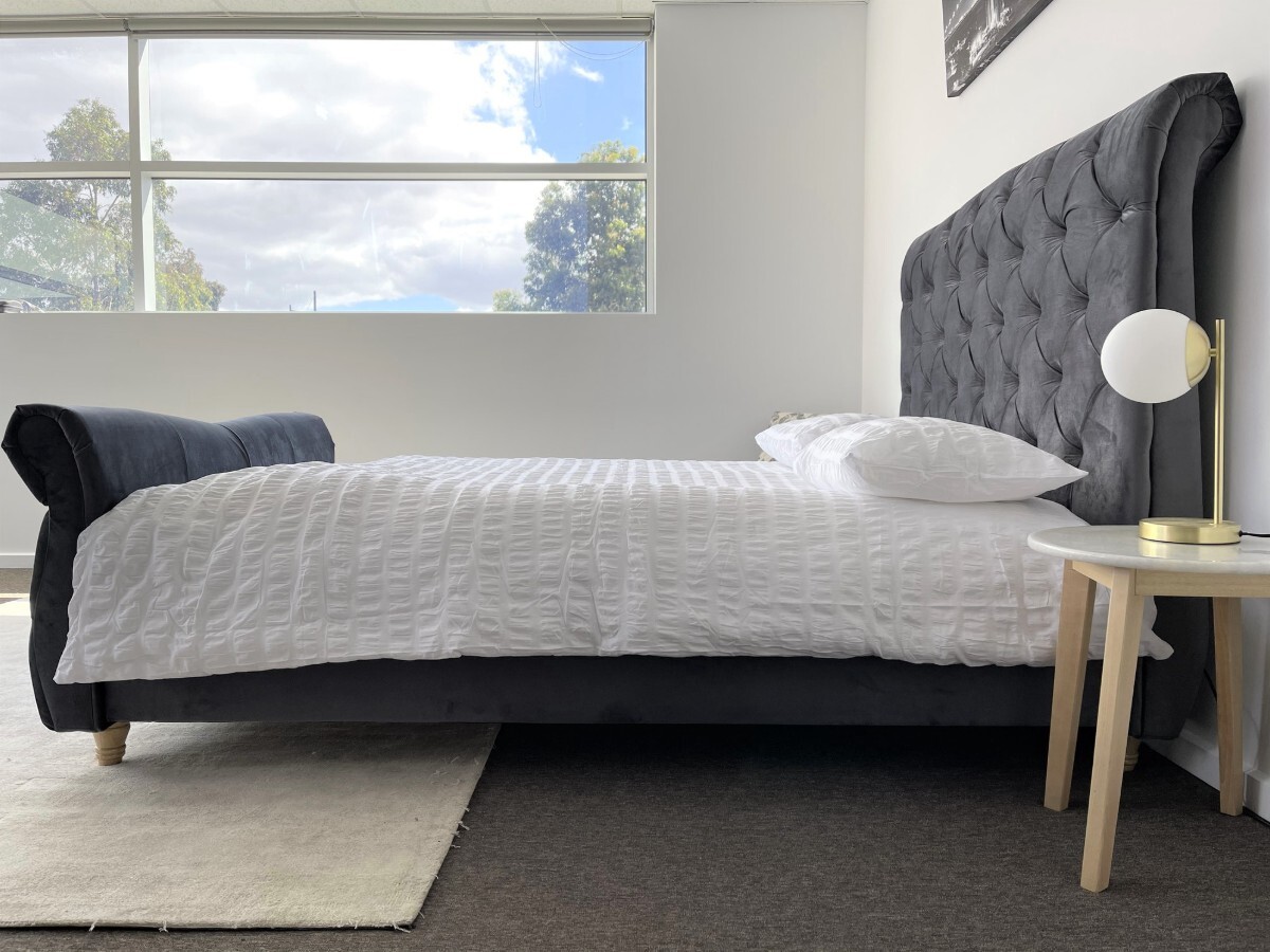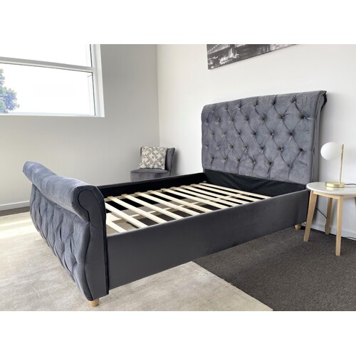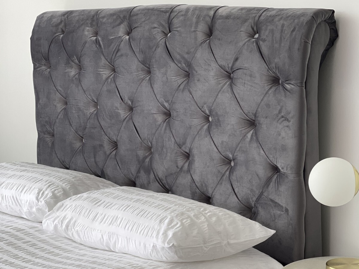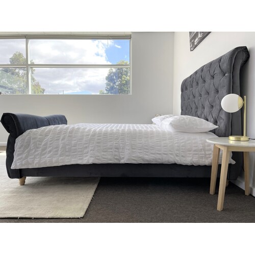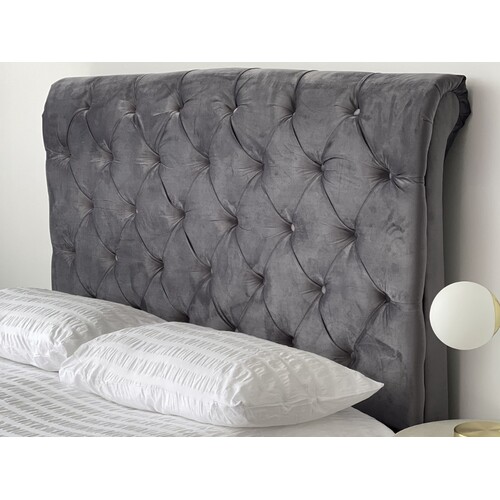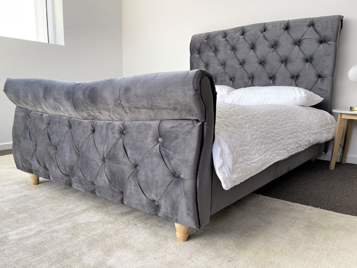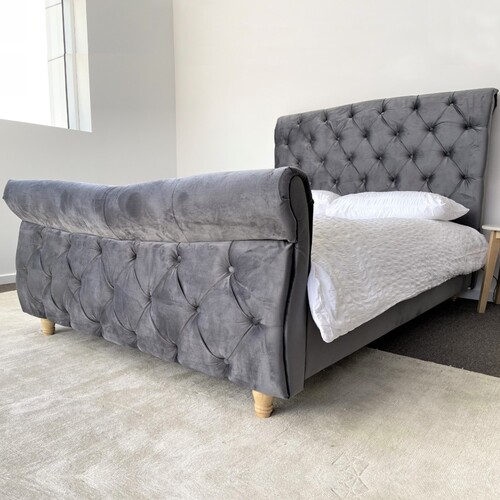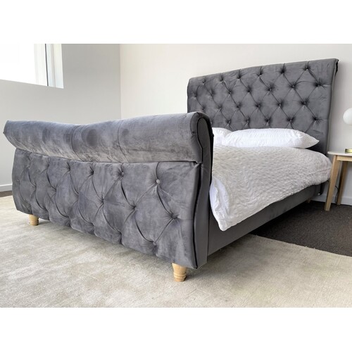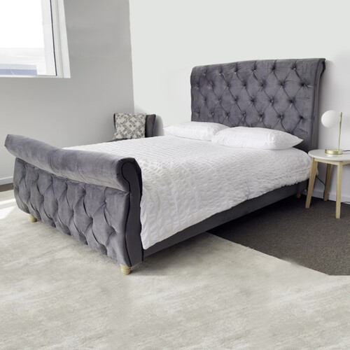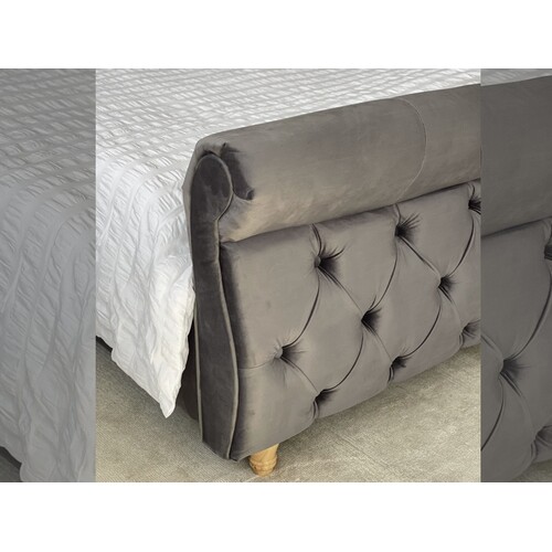 Our elegant and eye-catching Azalea double bed is upholstered in a rich grey plush velvet and complemented by french provincial design with button tufting on the headboard and footboard. Beautifully designed for your comfort with a touch of classic.