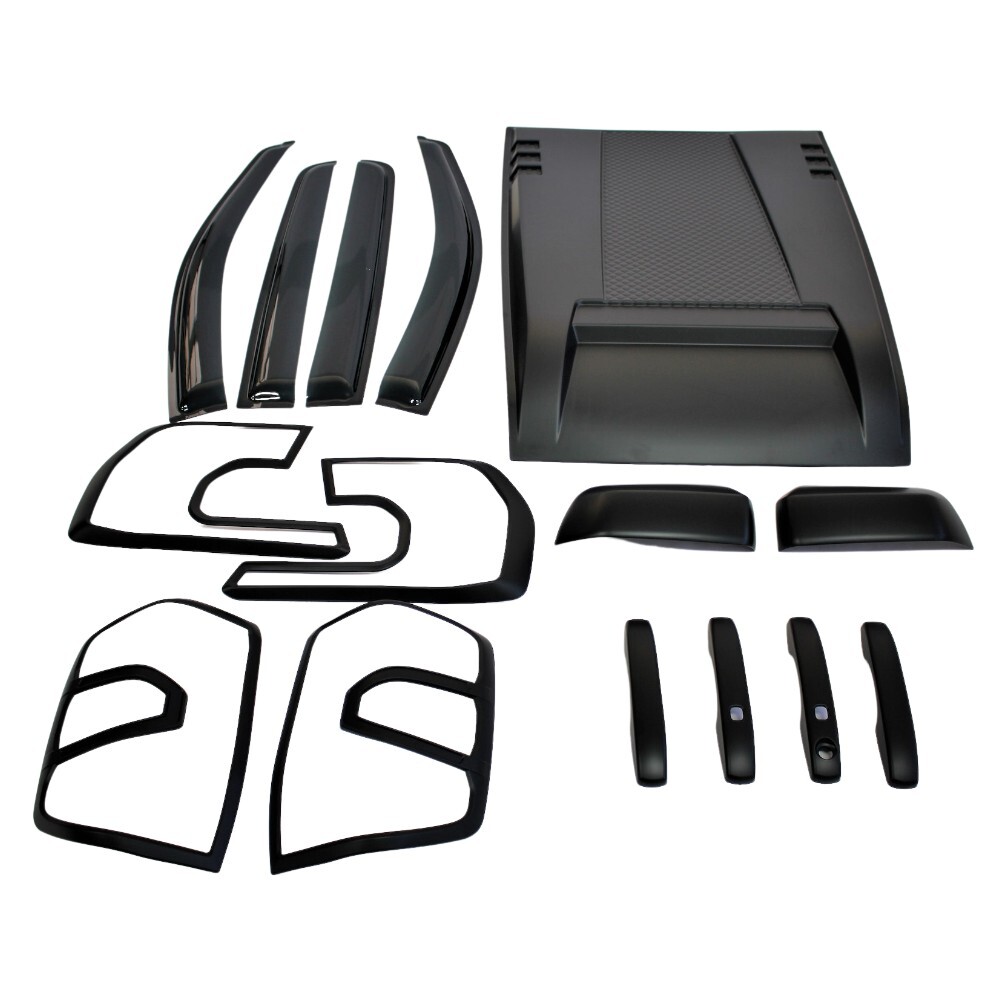 This 6-in-1 Combo kit contains a Bonnet scoop, Weather shields, Headlight trim, Tail light trim, Mirror covers and Door handle covers.
