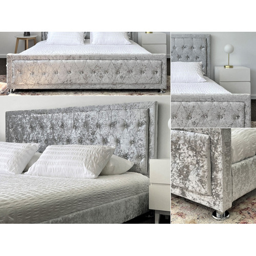 Gorgeous and glamorous, the Chanel king size bed frame is a beautiful designer bed set for the bedroom. This will complete your whole room to a serene retreat for you to rest your head at the end of a long day. Luxuriously padded and upholstered in a beautiful velvet fabric with stunning crystal studs all along headboard and footboard.