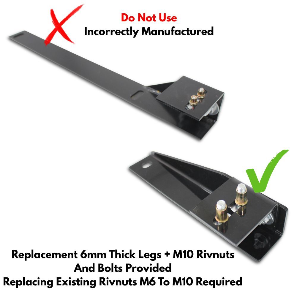 Installation requires the removal of existing M6 rivnuts and upgrading to M10 rivnuts