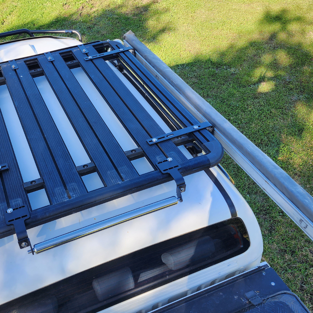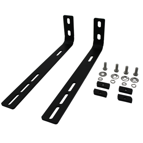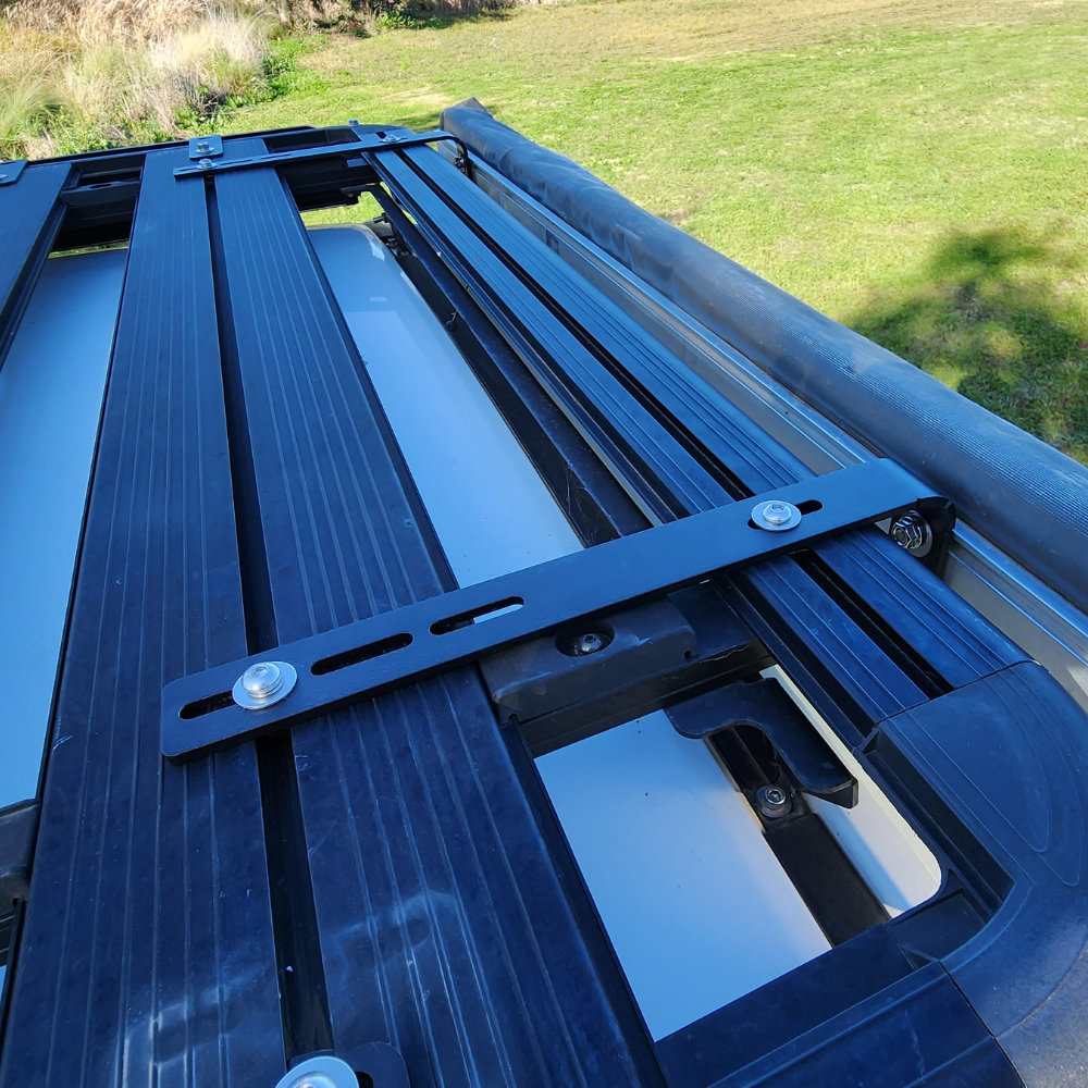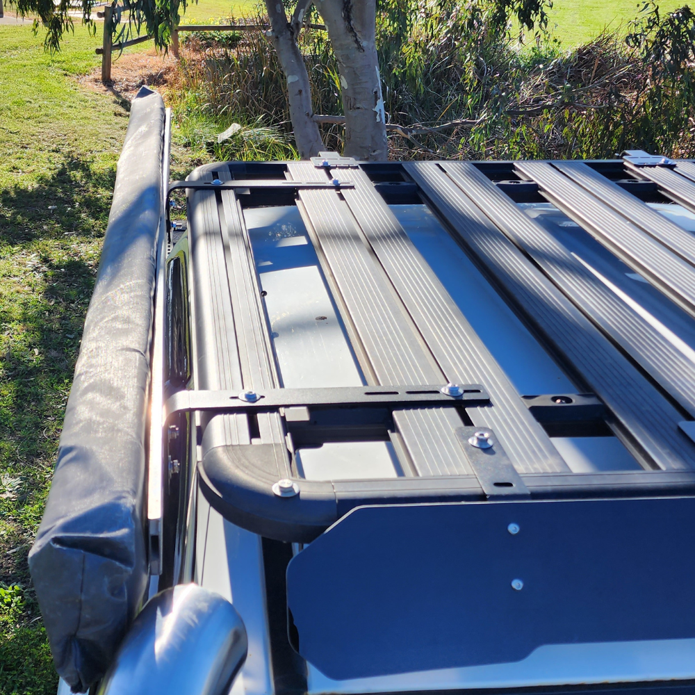 Introducing the Awning Bracket Kit for flat aluminium roof racks - your perfect solution for attaching your existing shade awning to almost any aluminium roof rack with a channel system. This product offers hassle-free installation. Simply slide the brackets into the flat rack platform channel and attach your awning for a secure fit. These brackets provide extra strength, accommodating heavier awnings, while the powder-coated black finish ensures reliability and excellent resistance against corrosion. Enjoy the convenience and durability of this Awning Bracket kit for your outdoor adventures!