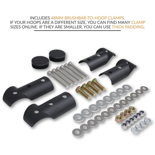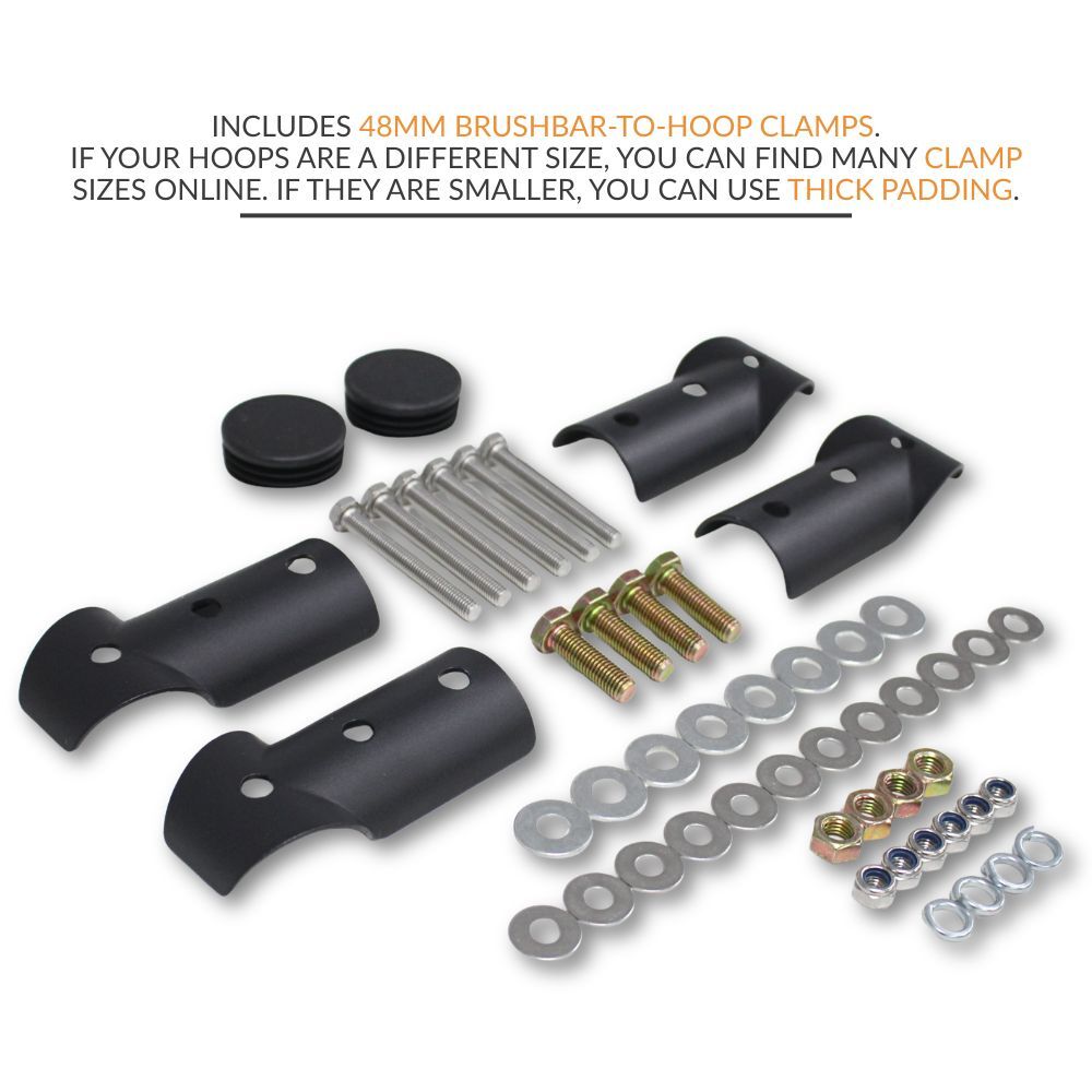Supplied with 48mm brush bar clamps (only suits bull bars with 48mm diameter tube).