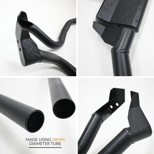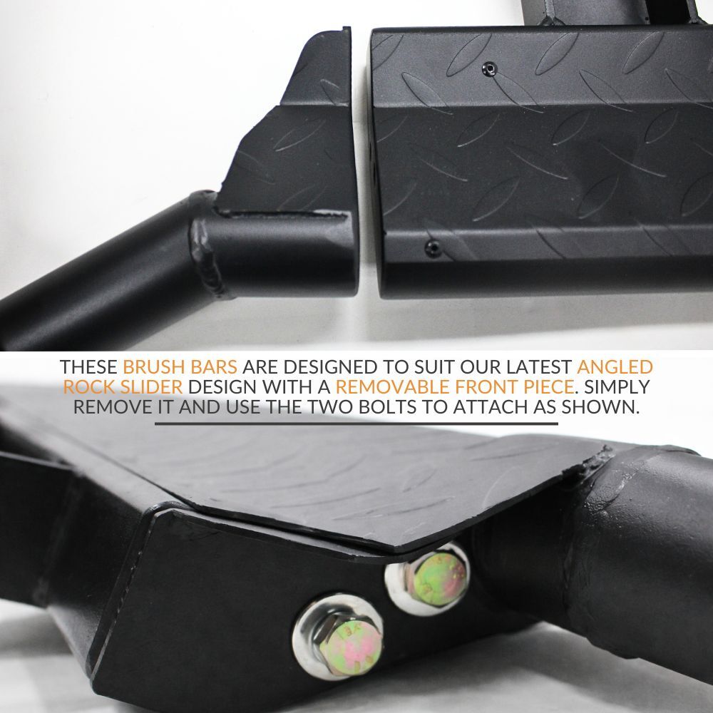 Manufactured from 48mm diameter heavy-duty powder-coated steel, these brush bars are built to last. They are designed to connect from your angled rock sliders to your bull bar hoops and are made extra long so they can be trimmed and adjusted to suit your specific bull bar setup.