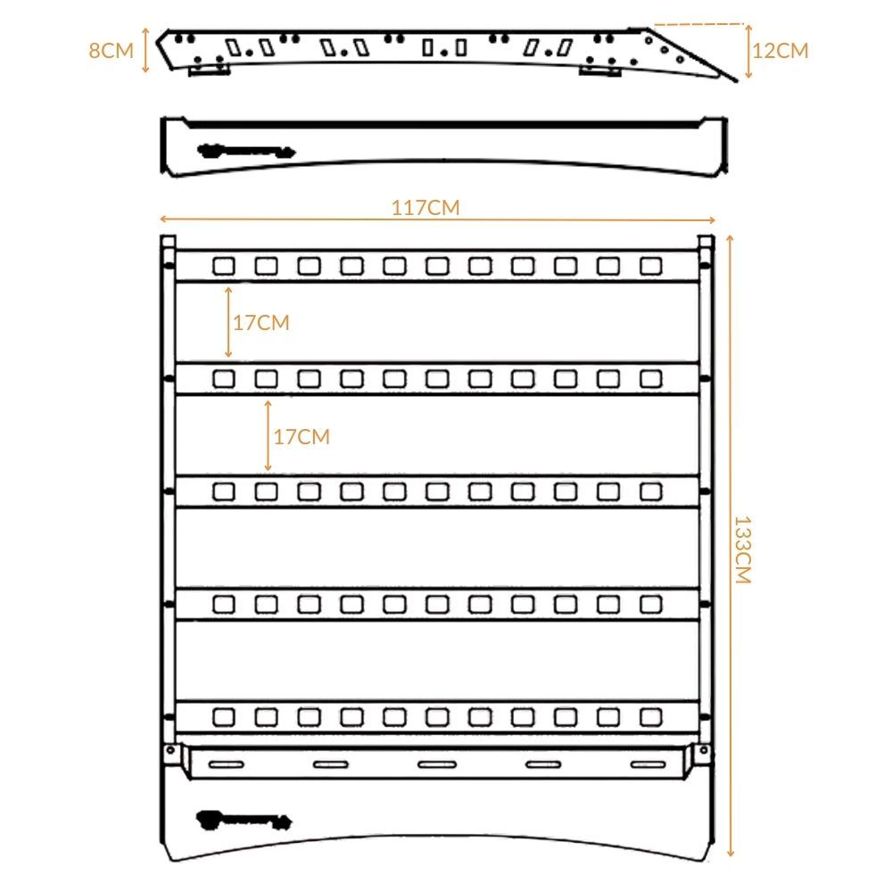 • Low-Profile Full-Length Design: Maximise your roof space with a low-profile, full-length design (133 x 117 cm), providing ample room for all your gear while maintaining a sleek, aerodynamic look. At only 80mm high, this rack is one of the lowest platforms on the market, ensuring you stay under height restrictions like carparks, without sacrificing functionality.