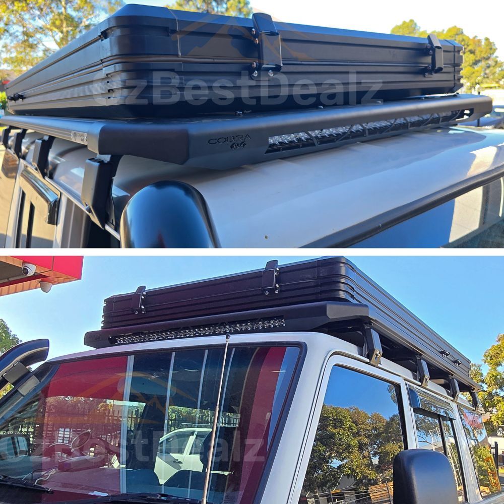 Note: Suits Cobra 4x4 142.5cm wide aluminium platforms with 5 panels as shown in the images. Platforms from other sellers may also suit if you like to check with us first. Will not suit our aluminium 142.5 wide flat racks with 4 panels unless you drill into the bracket to make new holes to match the 4 panels