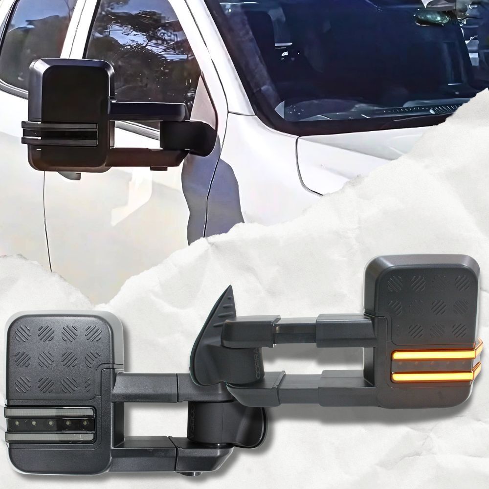 Cobra 4x4 Gen 2 Extendable Towing Mirrors Suit Landcruiser 200 Series 2007 Onwards Black Electric LED Indicators Caravan Trailer