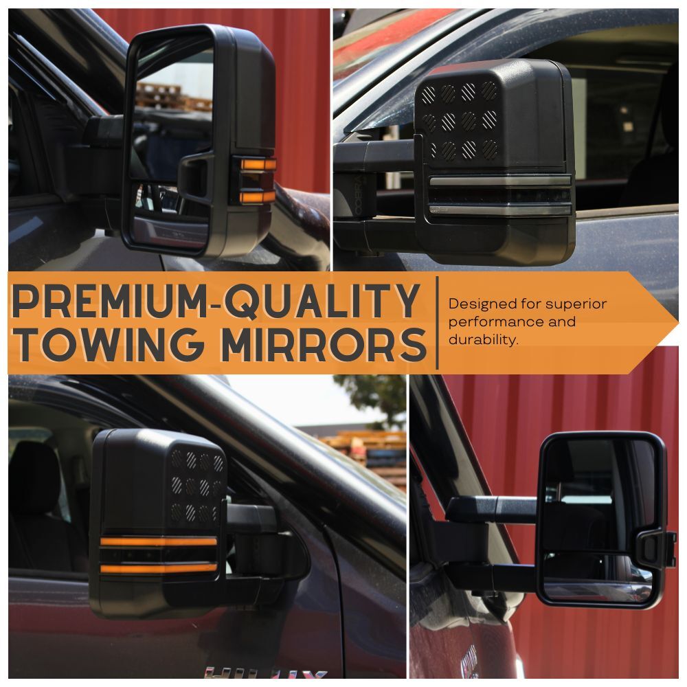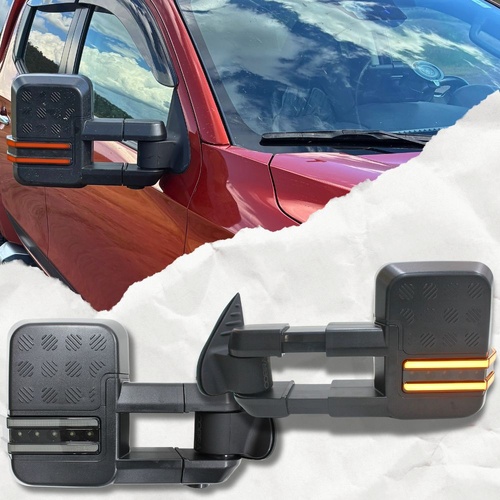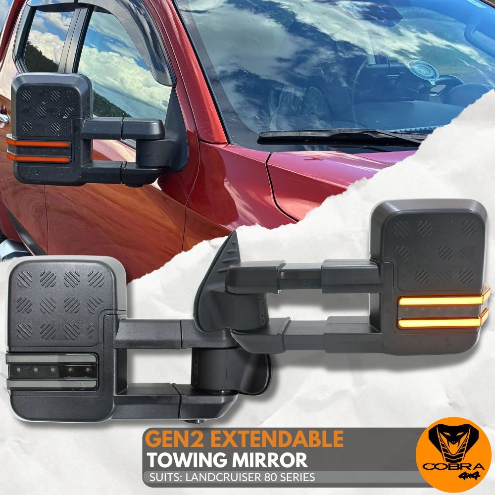 Cobra 4x4 Gen 2 Extendable Towing Mirrors Suit Landcruiser 80 Series Black Electric LED Indicators Caravan Trailer