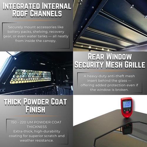 • Internal Roof Channels – Mount recovery gear, battery packs, water tanks & more — from inside the canopy.