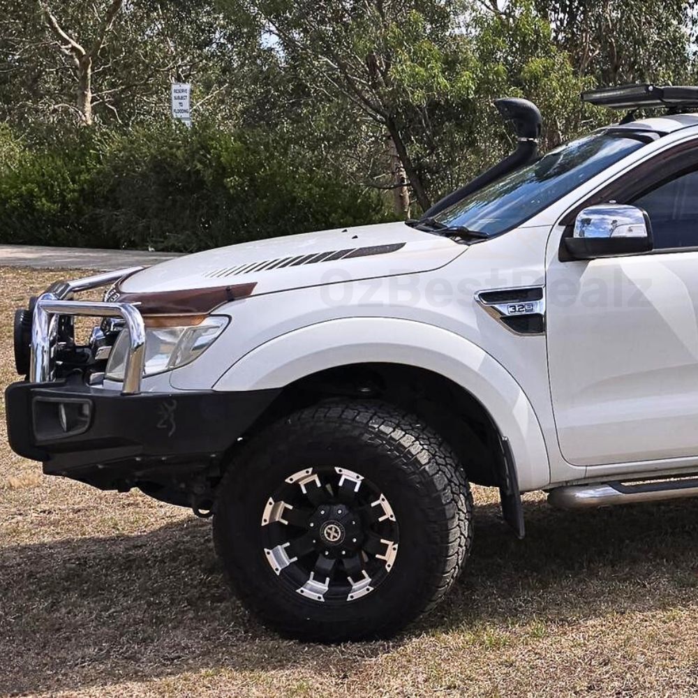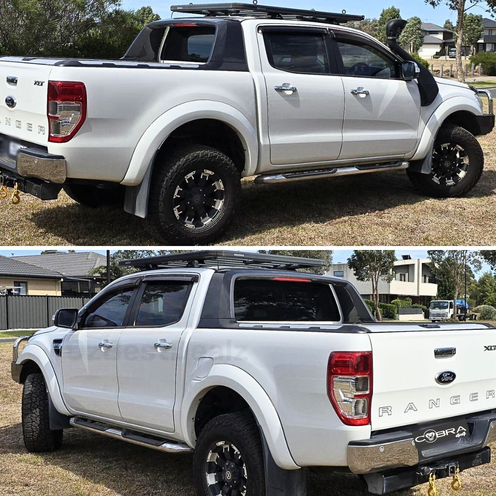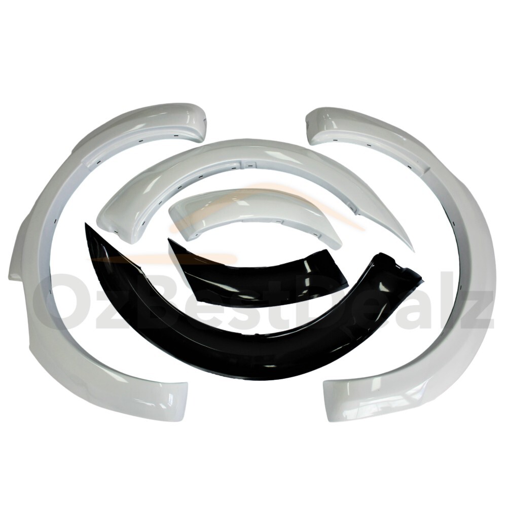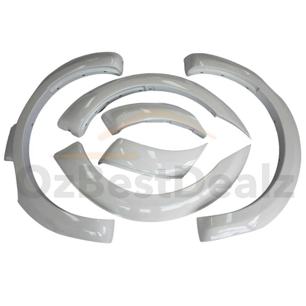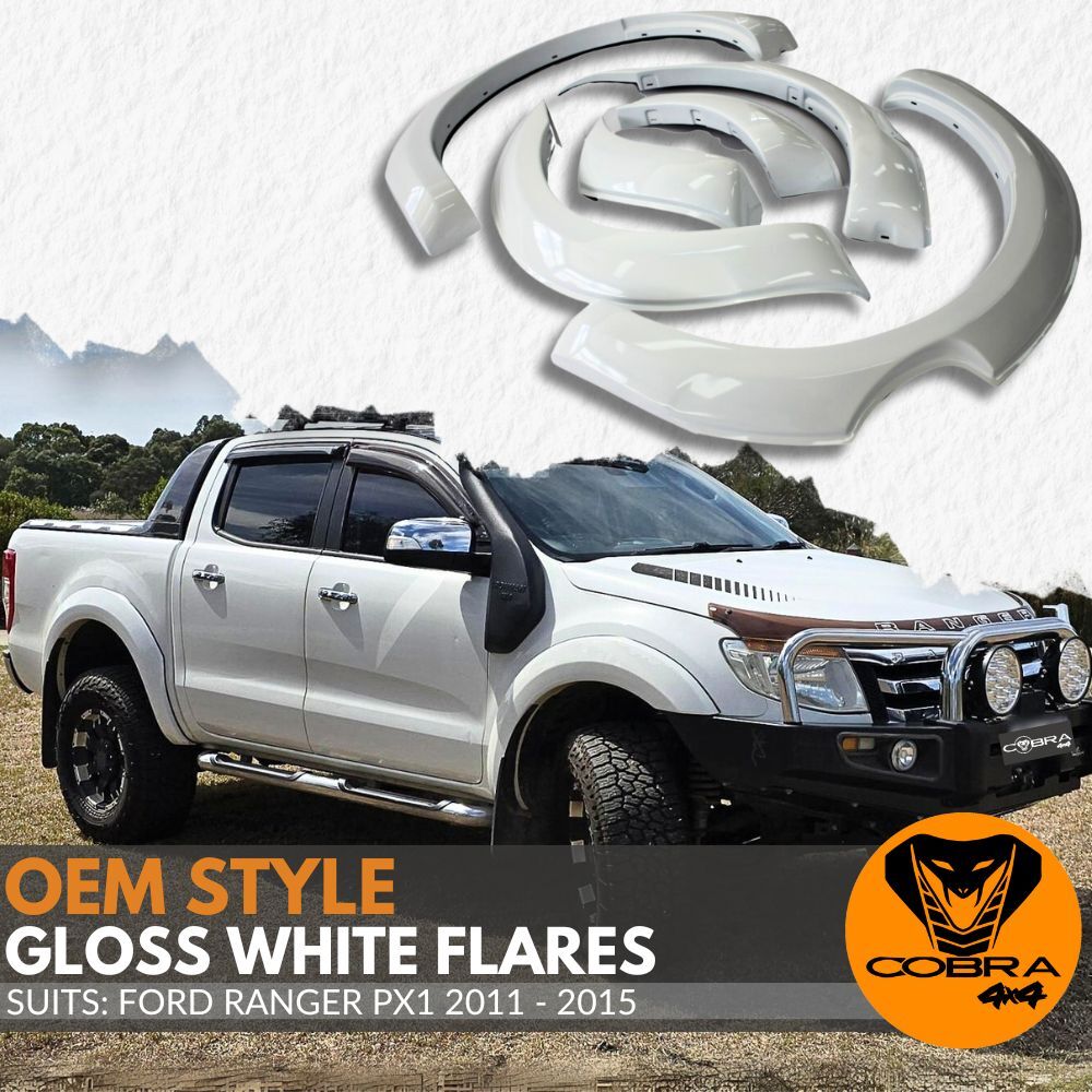 The OEM style gloss white flares to suit Ranger dual cab PX1 2011 to 2015  will give you the wheel cover you need for larger tyres adding roughly 45mm extra cover. The illustration shows the colour match with a cool white Ford ranger. It's not a 100% match however it's close and great for those who don't want to spend another $300-$400 on getting them painted.
