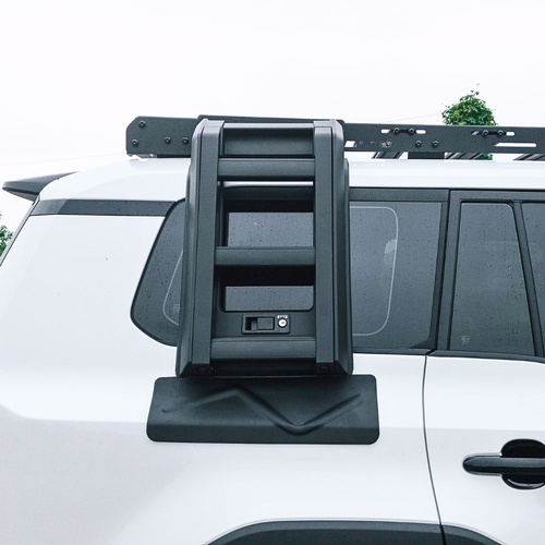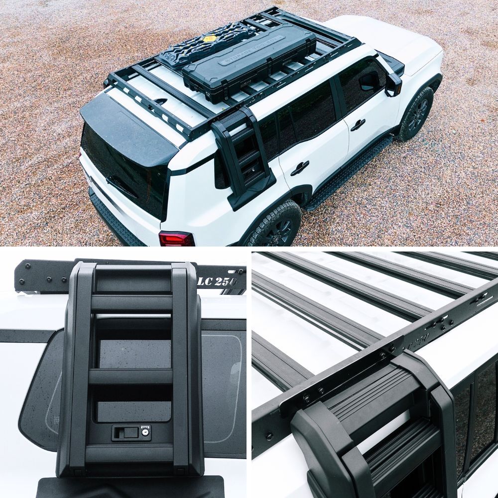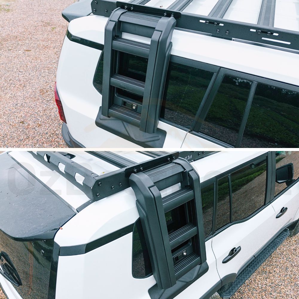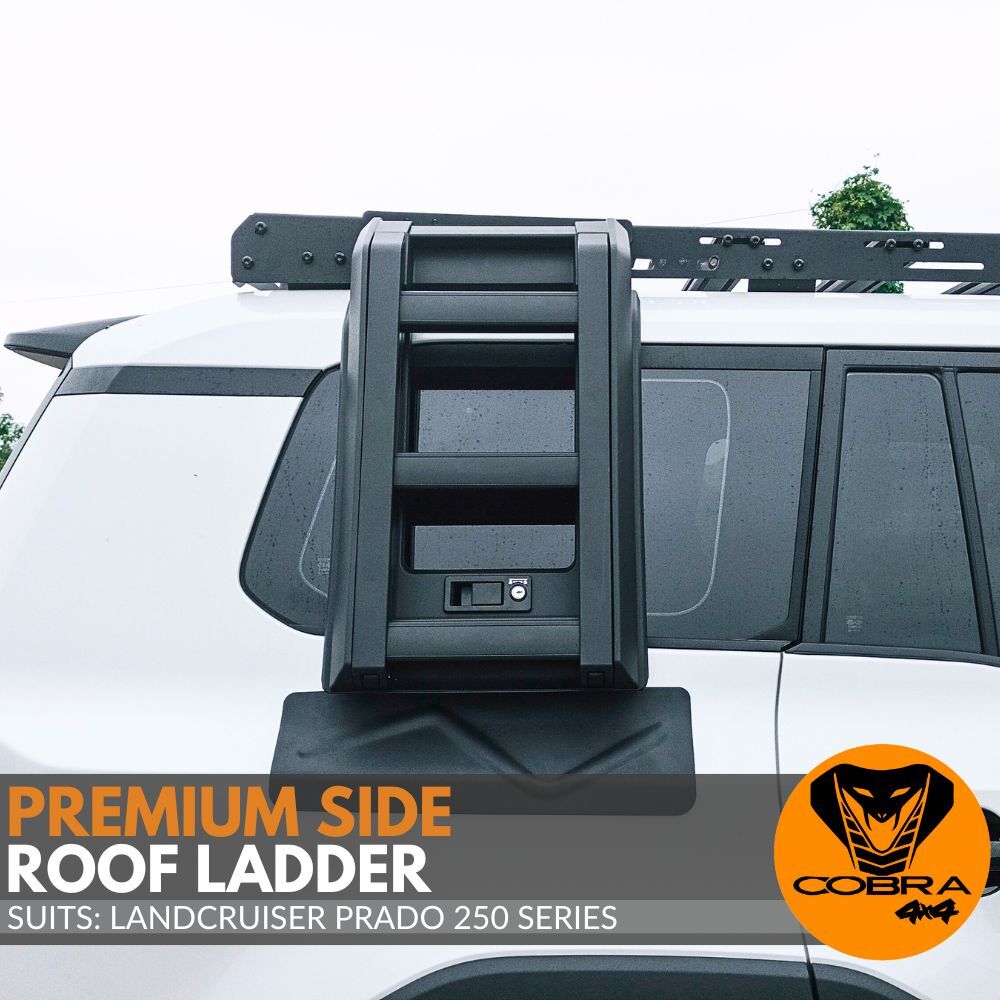 The Cobra 4x4 Premium Foldable Side Roof Ladder is designed to suit  Landcruiser Prado 250 Series models equiped with the Cobra 4x4 Aluminium roof rack mentioned above, offering a stylish and practical solution for accessing your roof rack with ease. Built from durable Aluminium materials and finished in sleek black, this ladder ensures a secure fit while enhancing the rugged look of your vehicle. Ideal for off-road enthusiasts, it provides convenience and reliability for loading gear, or accessing your roof top tent, making it a perfect addition to your  Landcruiser Prado 250 Series.