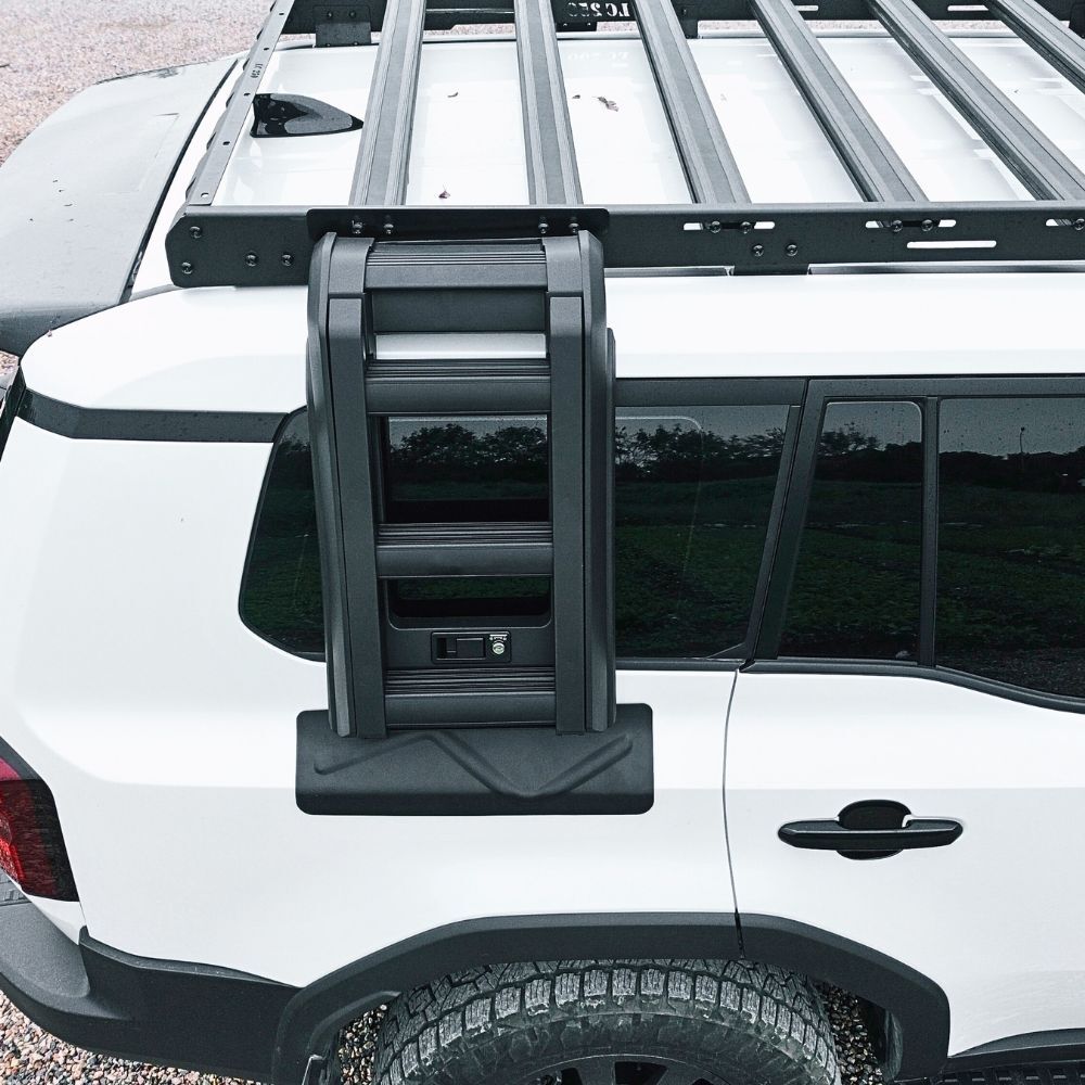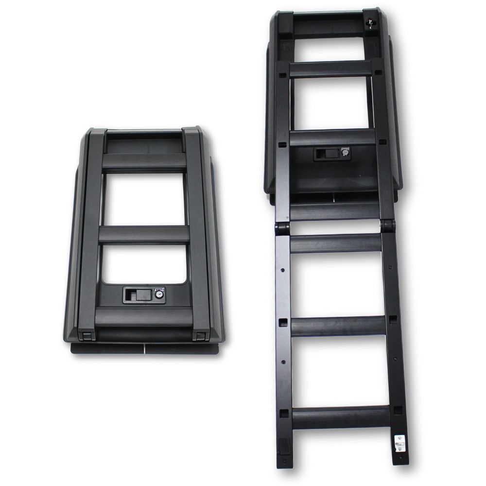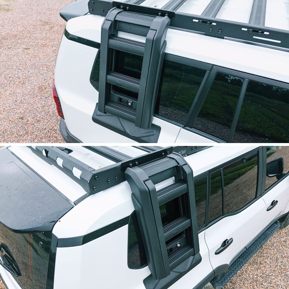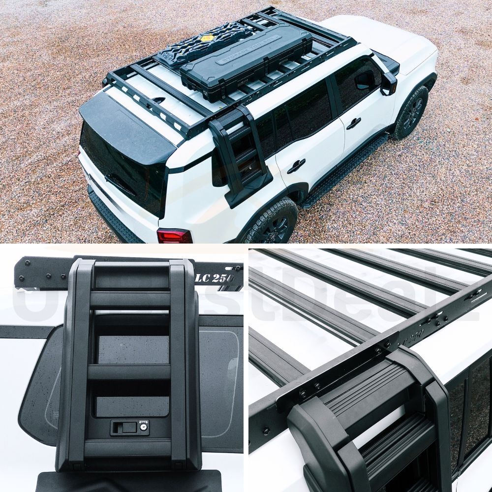 The Cobra 4x4 Premium Foldable Side Roof Ladder is designed to suit  Landcruiser Prado 250 Series models equiped with the Cobra 4x4 Aluminium roof rack mentioned above, offering a stylish and practical solution for accessing your roof rack with ease. Built from durable Aluminium materials and finished in sleek black, this ladder ensures a secure fit while enhancing the rugged look of your vehicle. Ideal for off-road enthusiasts, it provides convenience and reliability for loading gear, or accessing your roof top tent, making it a perfect addition to your  Landcruiser Prado 250 Series.