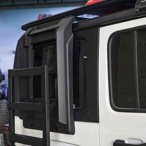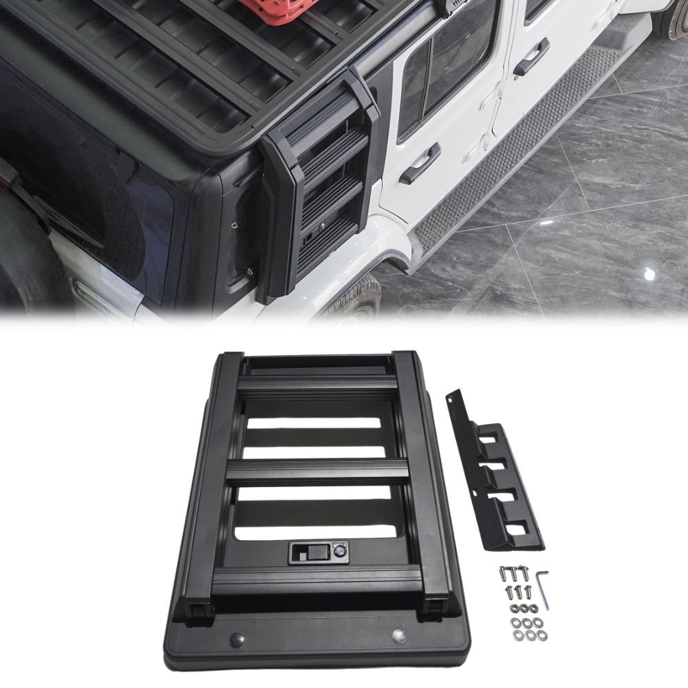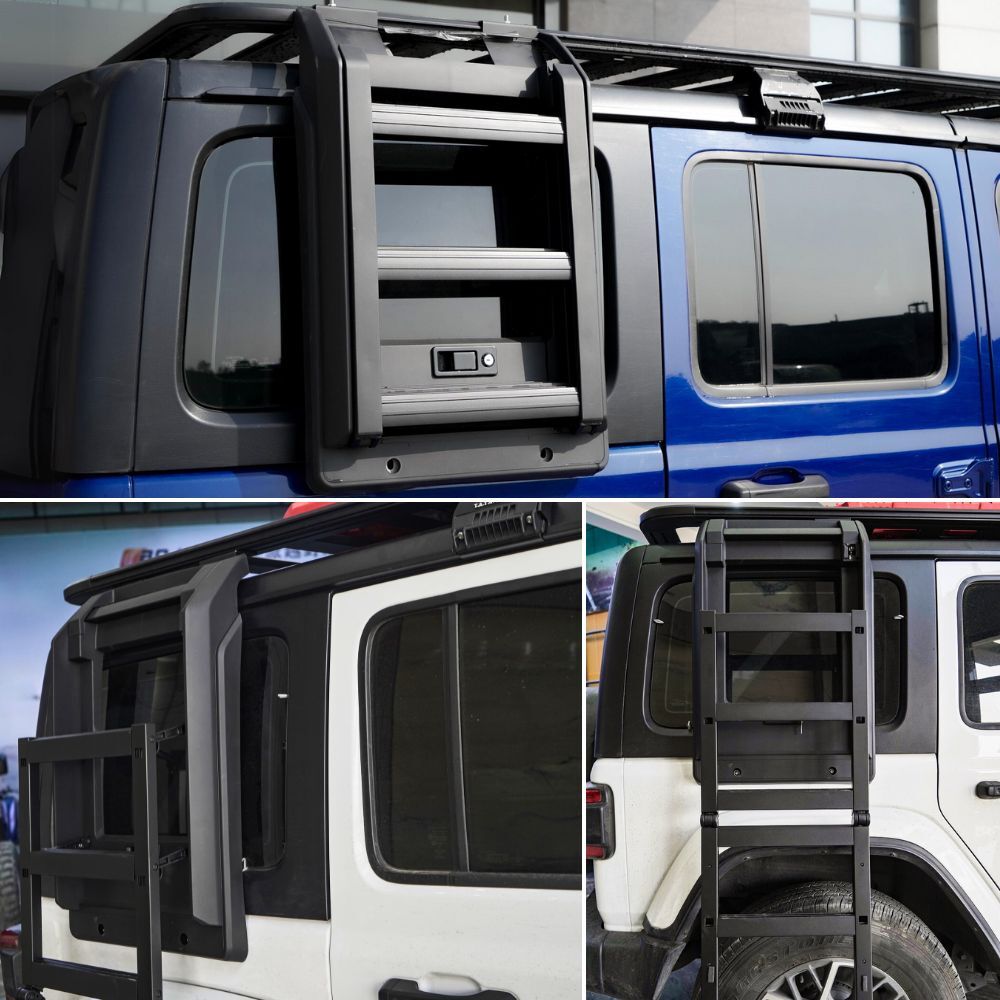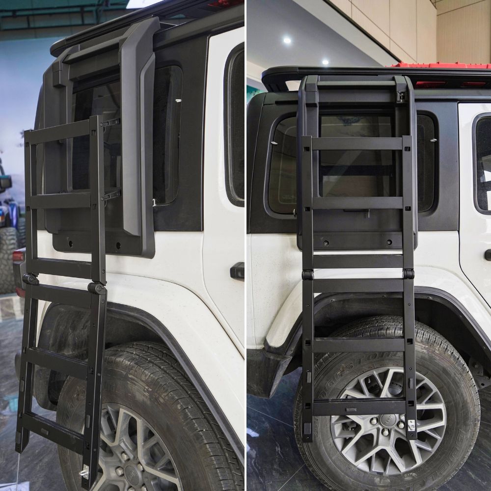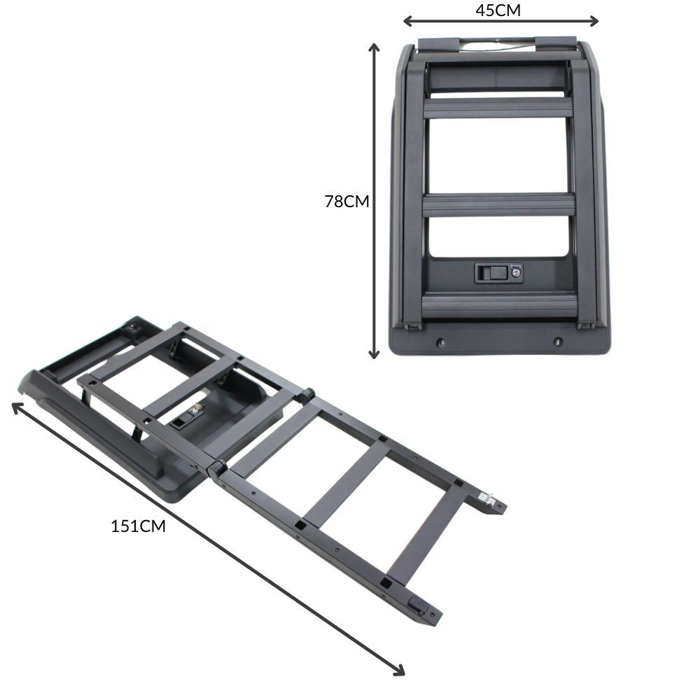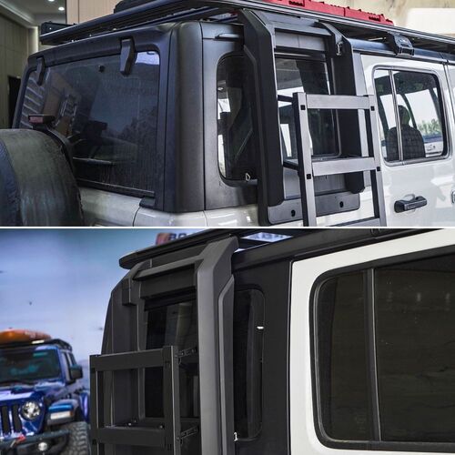 The Cobra 4x4 Premium Foldable Side Roof Ladder is designed to suit Jeep Wrangler JL models equiped with the Cobra 4x4 Aluminium roof rack mentioned above, offering a stylish and practical solution for accessing your roof rack with ease. Built from durable Aluminium materials and finished in sleek black, this ladder ensures a secure fit while enhancing the rugged look of your vehicle. Ideal for off-road enthusiasts, it provides convenience and reliability for loading gear, or accessing your roof top tent, making it a perfect addition to your Jeep Wrangler JL.