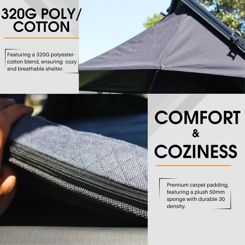 • All-Weather Resilience and Longevity: Engineered to endure the elements, our rooftop tent features 320Gsm poly-cotton fabric boasting a waterproof rating of 5,000mm and UV protection of 50+