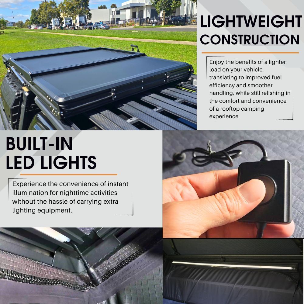 • Illuminate Your Nights: Enhancing your rooftop experience, our tent includes an LED strip light bar for interior lighting, conveniently connectable directly to a USB port.
