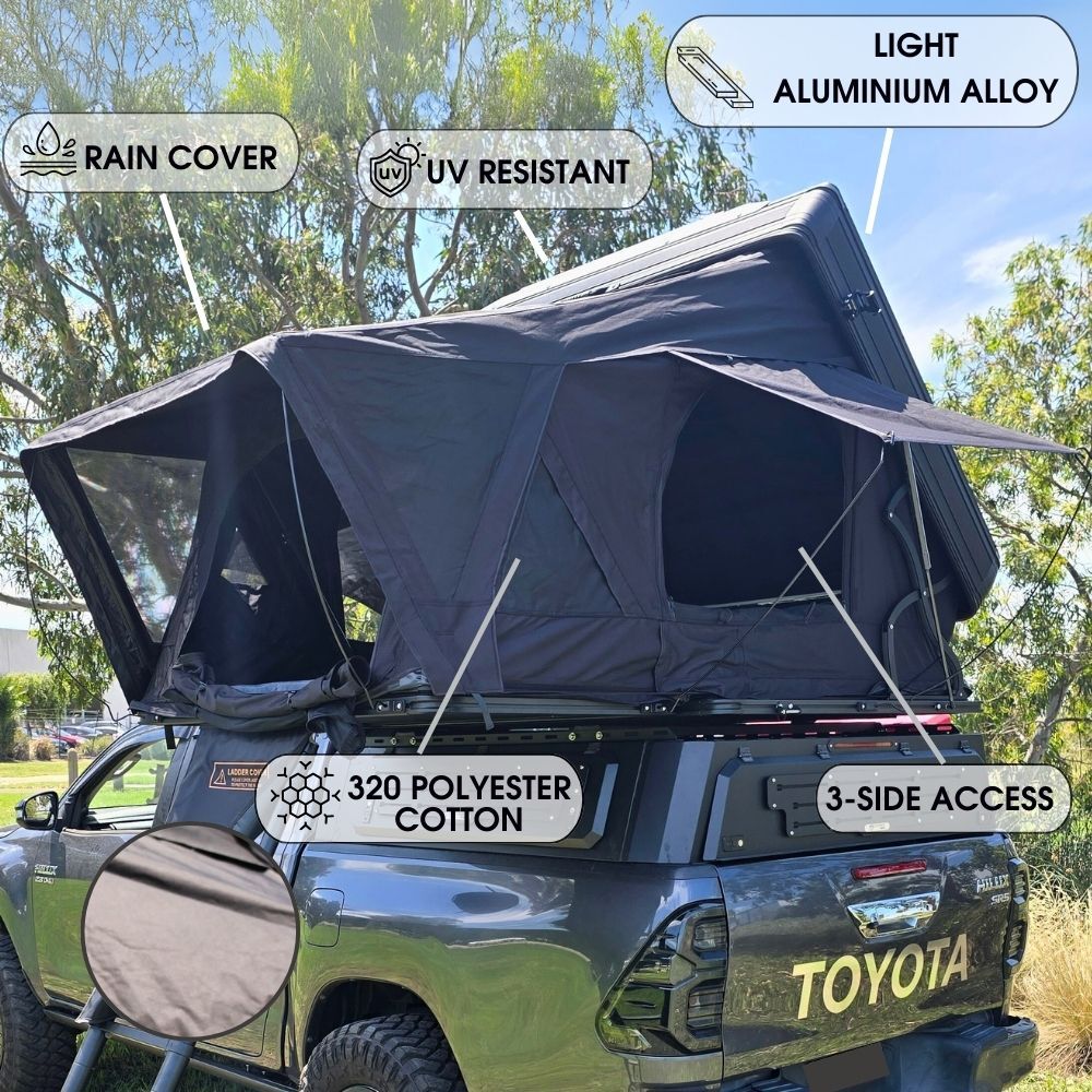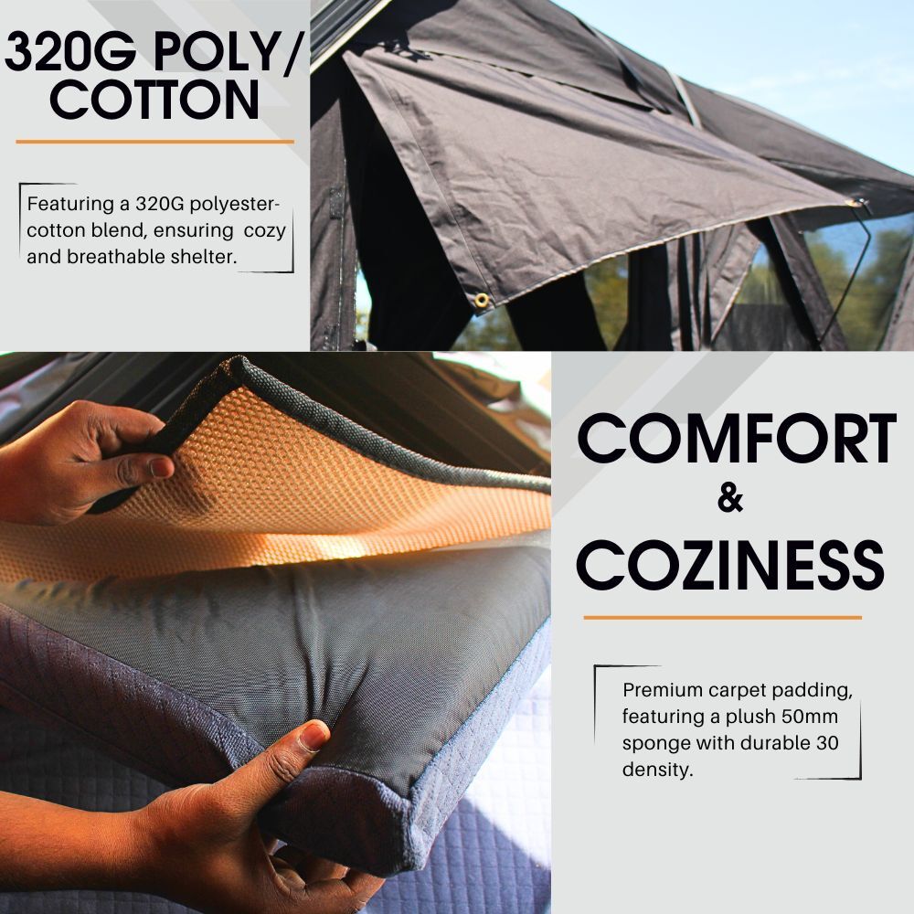 • All-Weather Resilience and Longevity: Engineered to endure the elements, our rooftop tent features 320Gsm poly-cotton fabric boasting a waterproof rating of 5,000mm and UV protection of 50+