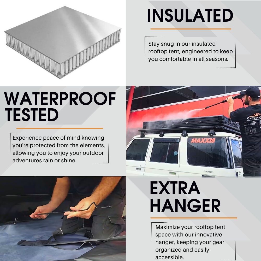 • Maintain Temperature Control: Our hard shell rooftop tent boasts a robust aluminum panel structure, ensuring exceptional insulation in varying climates, whether hot or cold.