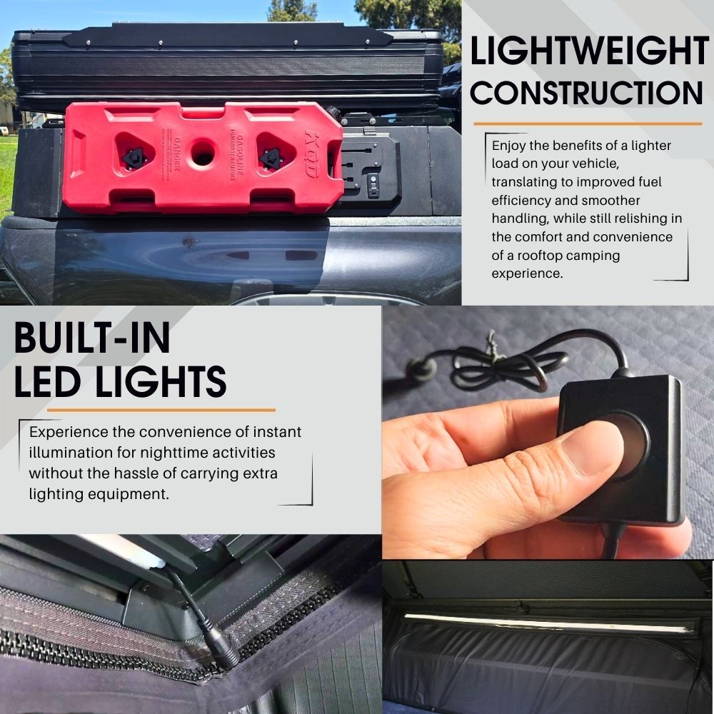 • Illuminate Your Nights: Enhancing your rooftop experience, our tent includes an LED strip light bar for interior lighting, conveniently connectable directly to a USB port.