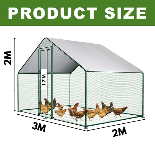 Looking for a spacious haven for your feathered friends? Look no further! Our premium chicken coop boasts an expansive 3m wide x 2m high x 2m deep space, providing ample room for up to 15 chickens or similar lovable critters. Crafted from durable galvanized powdercoated steel, this coop is built to last, ensuring years of protection and comfort for your cherished flock.