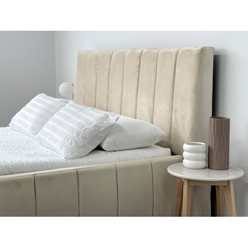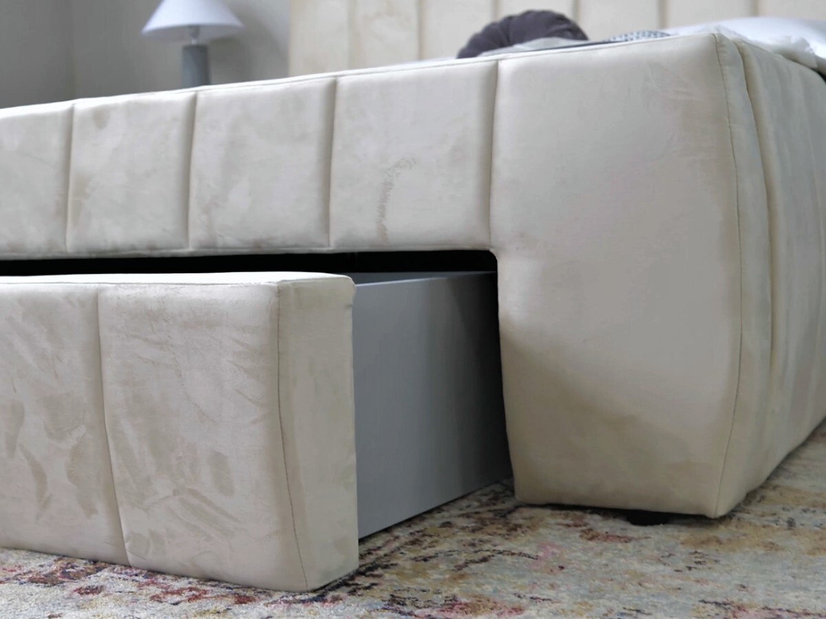 Luna Queen Bed Frame Beige Plush Velvet Fabric Upholstered Storage Drawer