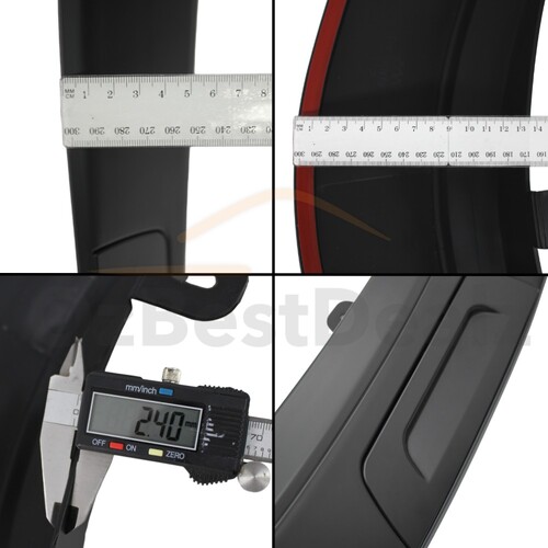 Please refer to the ad features for the overall flare width, measured from where they start on the metal guards. Measure from the top to see how much wheel coverage is added. as demonstrated in this video.