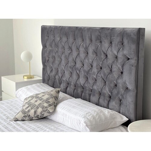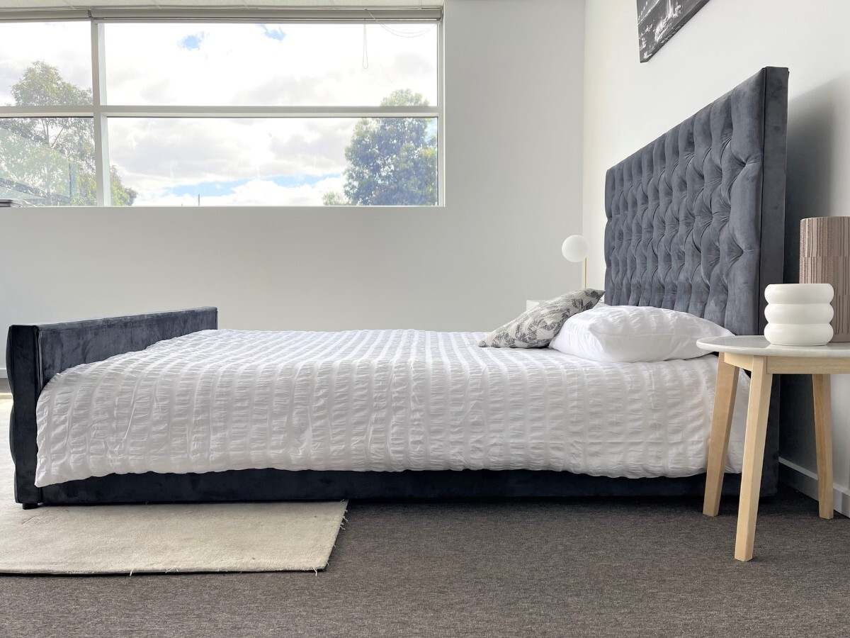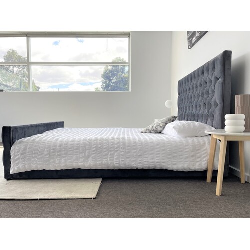 Update your bedroom with our contemporary Milan queen size bed! Upholstered with a soft to touch plush velvet in a rich grey color with fabric button tufts, you can't go wrong with this beautiful and simple design for your home.