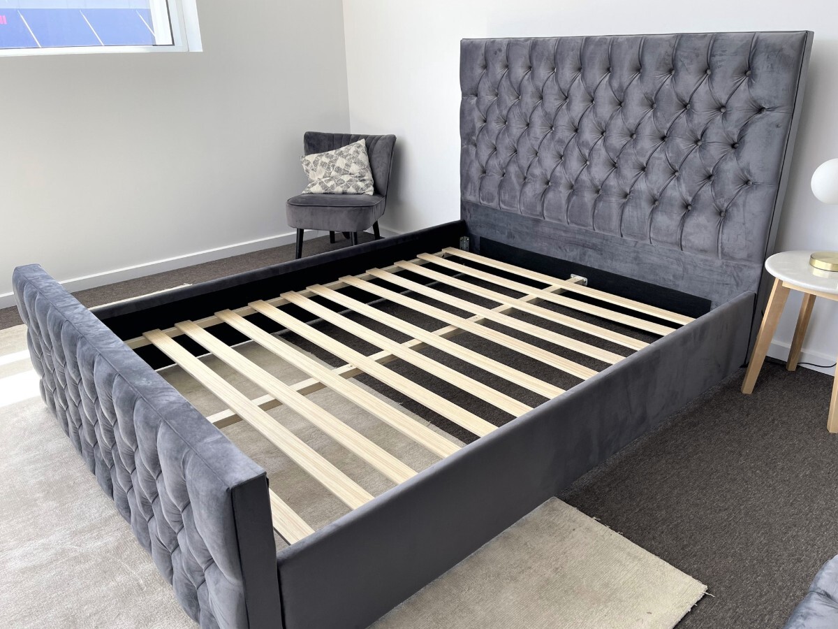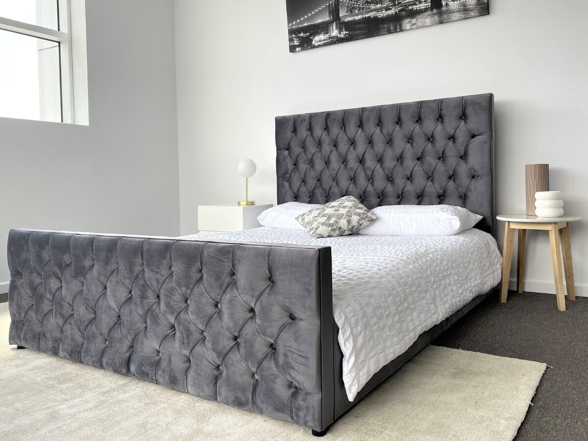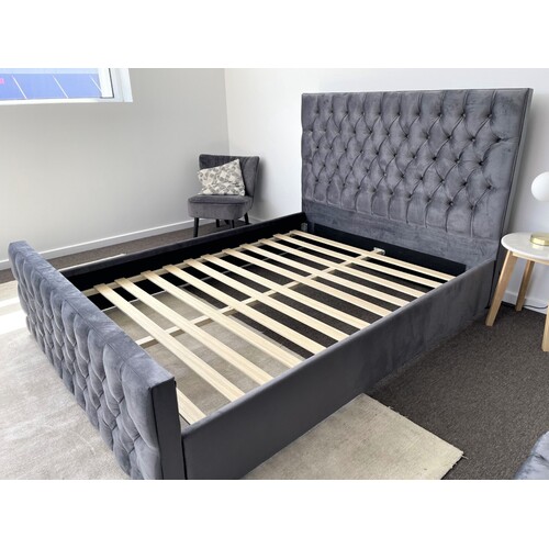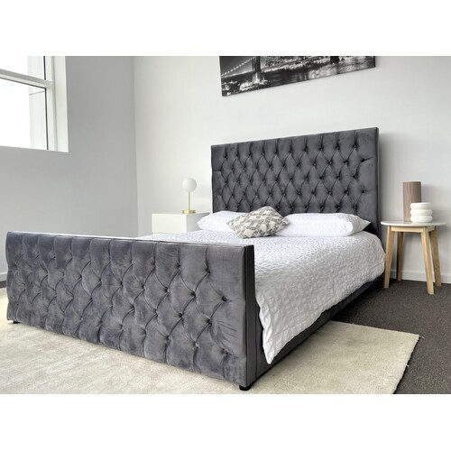Milan Queen Bed Frame Studded Fabric Grey Plush Velvet Upholstered Tufts