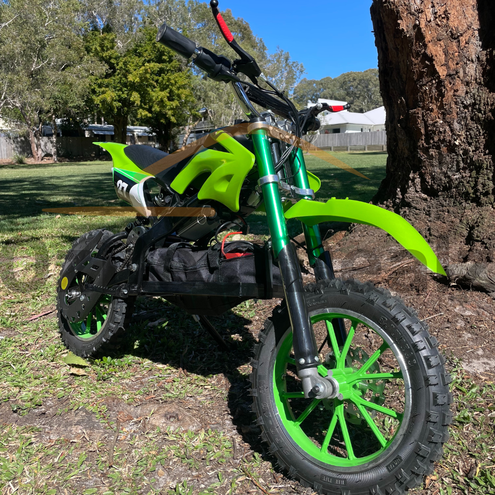 LIMITED EDITION 800w. Includes 10 Inch Off Road Real Rubber Tyres, Leather Seat, Starter key, Steel frame, Front and Rear Disc Breaks, Front Shock and Rear soring Suspension, and Steel fork.