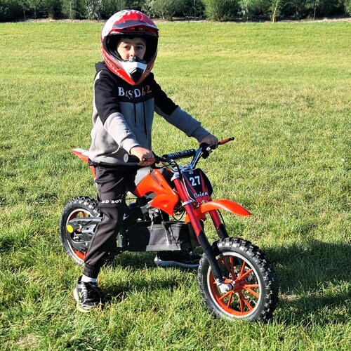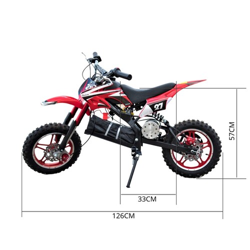 This electric dirt bike is pretty much the same as the real thing. The only difference is that the motor is electric. No noise, no pollution, no servicing, no engine rebuilds, and best of all no need to fill up with fuel. This is a reproduction of the original dirt bike with detailed elements and quality materials. This bike with its look and sporty profile will attract everyone's attention. 10 inch Off road real tires and suspension ensure comfortable riding on uneven surfaces.