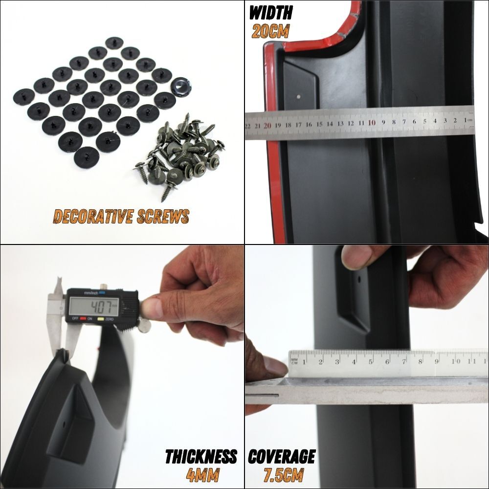 These flares are roughly 75mm wide from where they sit on the guards. They add that extra cover you need for larger wheels. Made from roughly 4mm thick ABS plastic.