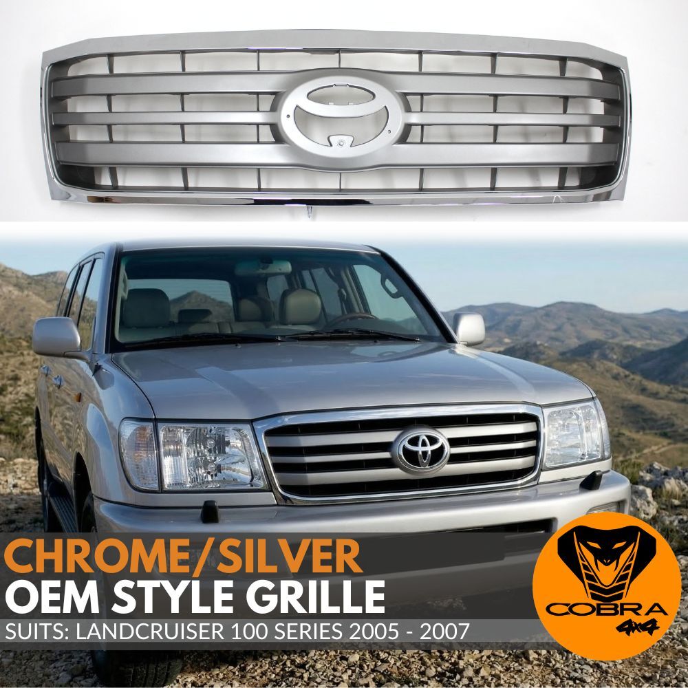 The all-new Cobra 4x4 aftermarket Metallic Silver OEM-style grille designed for the Landcruiser 100 Series. Restore the original look of your Toyota LandCruiser 100 Series with this high-quality OEM-style replacement grille. Designed to match the factory styling, this grille is perfect for replacing a damaged unit or refreshing the front end of your 100 Series. With a sleek silver finish and chrome surround, it provides a clean factory appearance while maintaining long-lasting durability in Australian conditions.