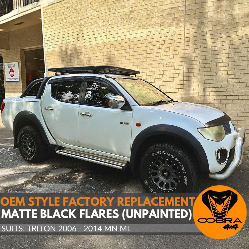 Cobra 4x4 is proud to introduce the all-new OEM style factory replacement matte black flares to suit the Mitsubishi Triton 2006 - 2014 Dual Cab Models. These flares will add the extra wheel cover you need. We are the first to introduce these aftermarket flares that won't cost you an arm and a leg but will give you a similar look as those flares worth $600 or more. You can use these for the extra wheel cover or just to enhance the look of your car. We think they look great as they are or if you like you can get them painted to suit your car.